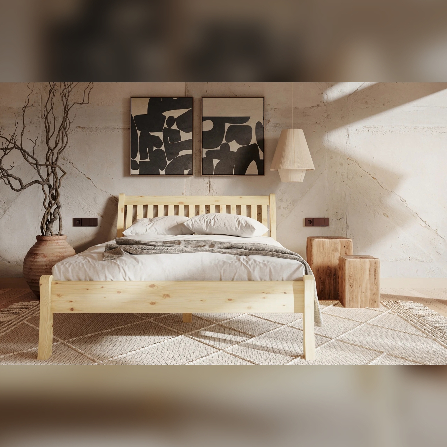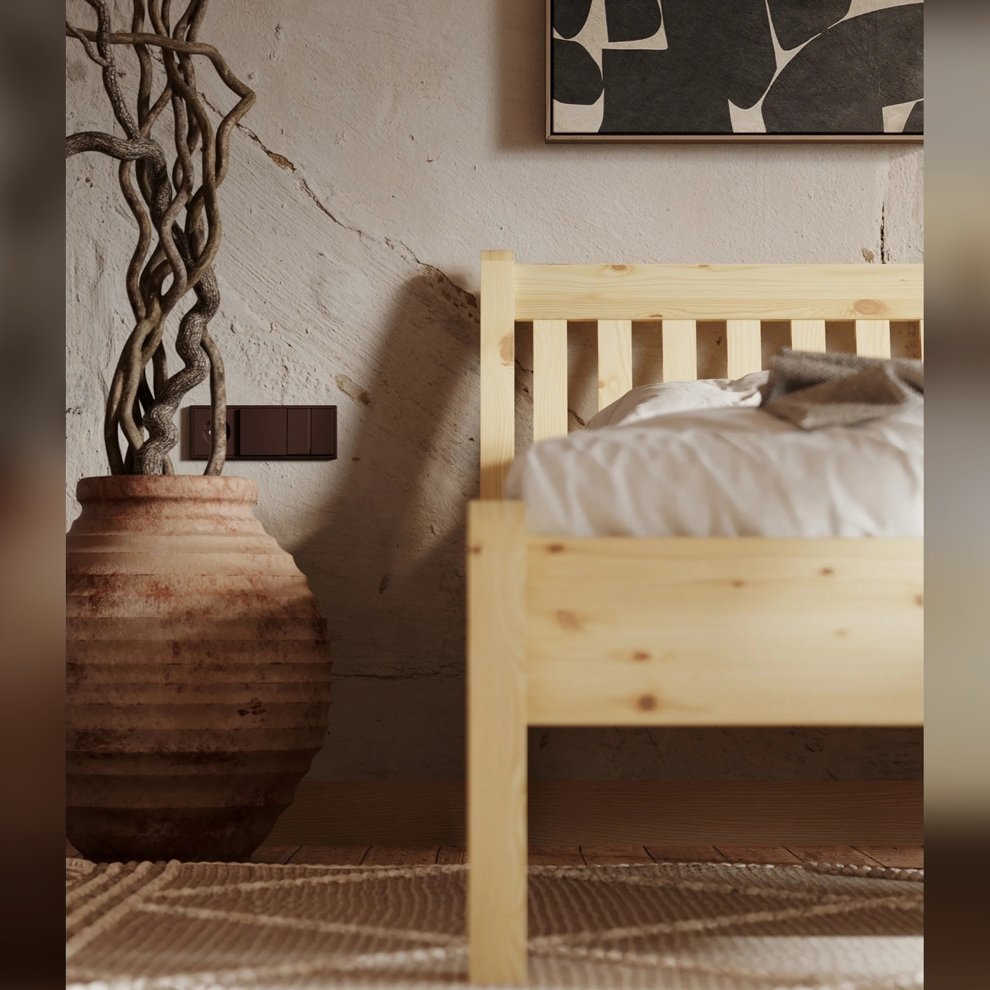 Postaw na sprawdzoną jakość i minimalistyczny design, wybierając łóżko sosnowe Tonja 180x200 cm. Ten inspirowany estońskim wzornictwem mebel to kwintesencja prostoty, funkcjonalności i bliskości z naturą. Wykonane w całości z litego drewna sosnowego, to duże łóżko dwuosobowe stanowi idealną bazę dla każdej sypialni małżeńskiej, w której liczy się komfort i ponadczasowa estetyka. Jego prosta, geometryczna forma oraz naturalne wykończenie lakierem podkreślającym piękno usłojenia drewna, sprawiają, że z łatwością wpasuje się w nowoczesne, skandynawskie czy minimalistyczne aranżacje. Solidna konstrukcja, wzmocniona dodatkową, piątą nogą, to gwarancja stabilności i spokojnego snu bez irytującego skrzypienia.