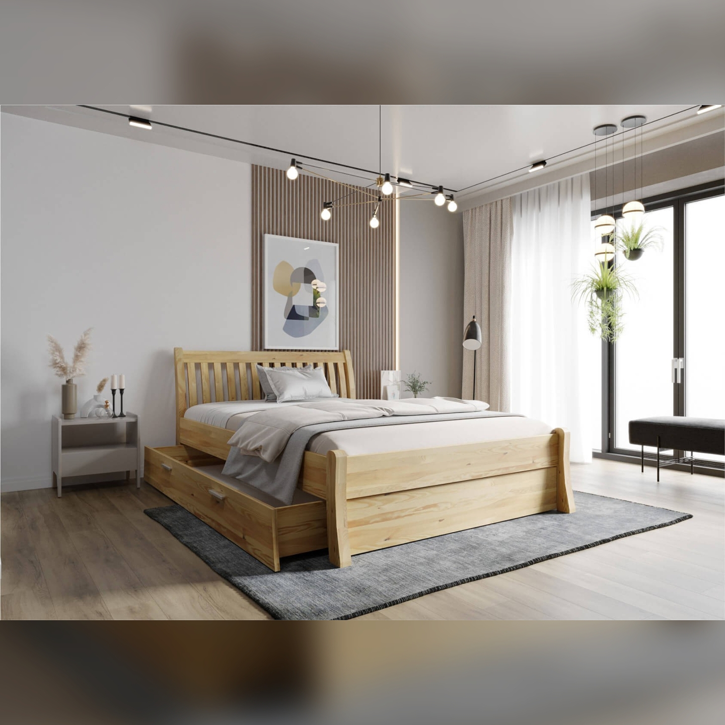 Rozszerz funkcjonalność swojego łóżka Tonja dzięki praktycznemu zestawowi Szuflad sosnowych Tonja. Ten moduł to idealne rozwiązanie dla każdego, kto ceni sobie porządek i maksymalne wykorzystanie przestrzeni w sypialni. Zaprojektowane z myślą o łóżkach o wymiarach 140x200, 160x200 i 180x200 cm, w tym zestawie otrzymasz dwie głębokie szuflady, które można umieścić po obu stronach ramy łóżka. Wykonane z trwałego drewna sosnowego i wykończone naturalnym lakierem bezbarwnym (korpus), szuflady Tonja stanowią estetyczne i solidne uzupełnienie mebla. Na załączonym zdjęciu widać, jak dwie przestronne szuflady (z białymi wstawkami na frontach w dolnej części – co dodaje im nowoczesnego akcentu), sprytnie wykorzystują przestrzeń pod łóżkiem, a widoczna blenda estetycznie maskuje całą konstrukcję, gdy szuflady są wsunięte.