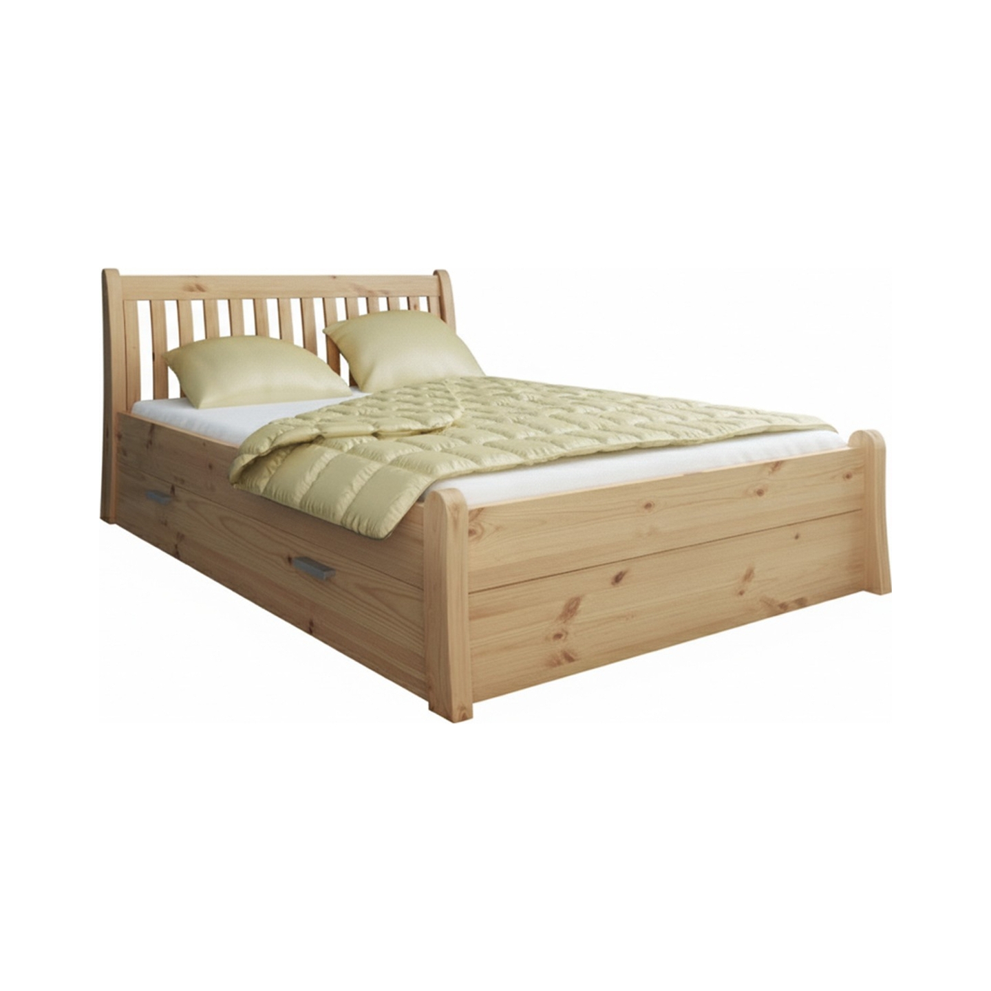 Zwiększ funkcjonalność swojego łóżka Tonja 160x200, dodając praktyczny zestaw Szuflad sosnowych Tonja. Ten moduł to idealne rozwiązanie, które pozwala w pełni wykorzystać niezagospodarowaną przestrzeń pod łóżkiem, przekształcając ją w dyskretne i pojemne miejsce do przechowywania. Zestaw jest specjalnie zaprojektowany dla łóżek w rozmiarach 140x200, 160x200 i 180x200. Otrzymujesz dwie głębokie szuflady, które są umieszczane po jednej na każdej stronie łóżka, co zapewnia łatwy dostęp do ich zawartości. Szuflady wykonane są z solidnego drewna sosnowego, a ich naturalny kolor, uzyskany dzięki lakierowi bezbarwnemu, idealnie komponuje się z ramą łóżka Tonja. Widoczna na zdjęciu konstrukcja łóżka z wysuniętą szufladą demonstruje, jak elegancko i sprytnie można przechowywać pościel, koce, czy inne przedmioty.