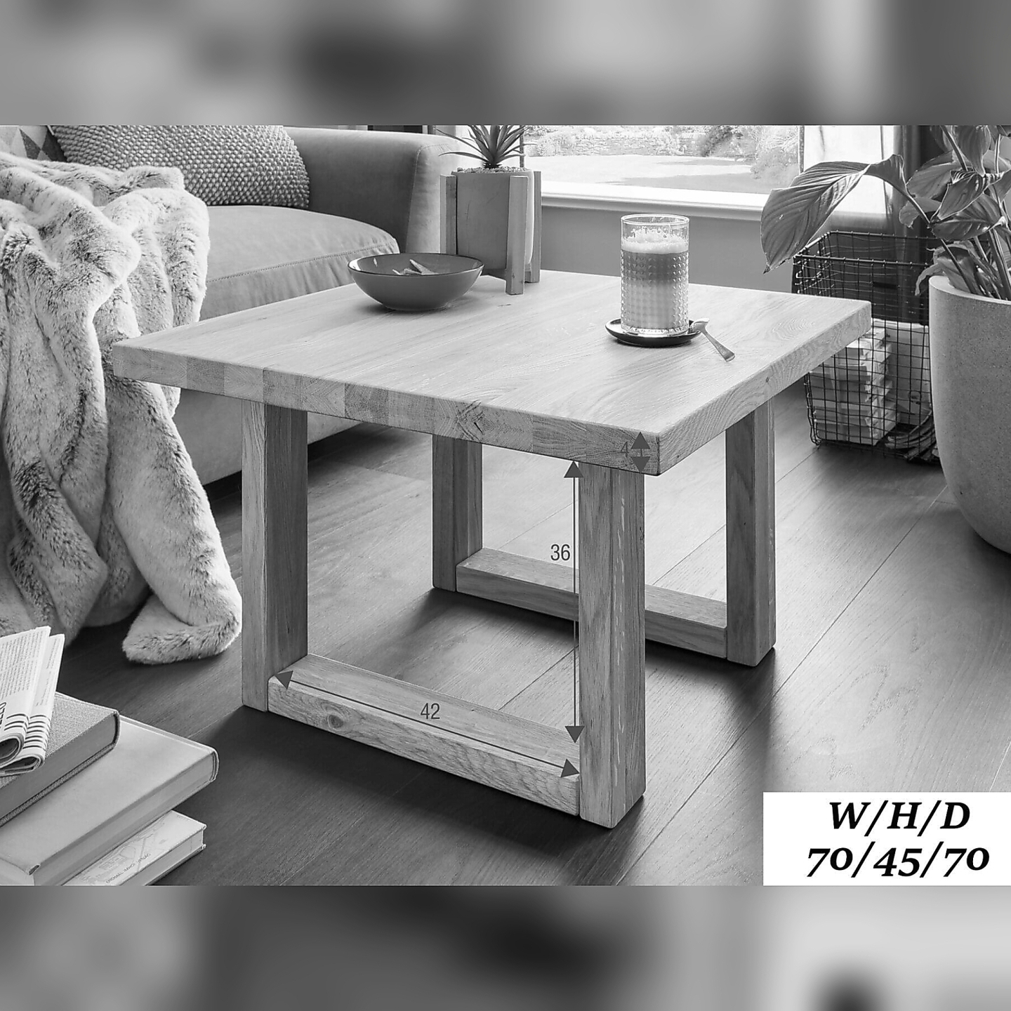 Stolik kawowy dębowy I Robusto to kwadratowy stolik wykonany w całości z litego dębu, wykończony olejem bezbarwnym i dostarczany jako mebel zmontowany. Wymiary 70 × 70 cm oraz wysokość 45 cm sprawiają, że dobrze wpisuje się w strefę wypoczynkową, zapewniając stabilną i funkcjonalną powierzchnię do codziennego użytkowania.
