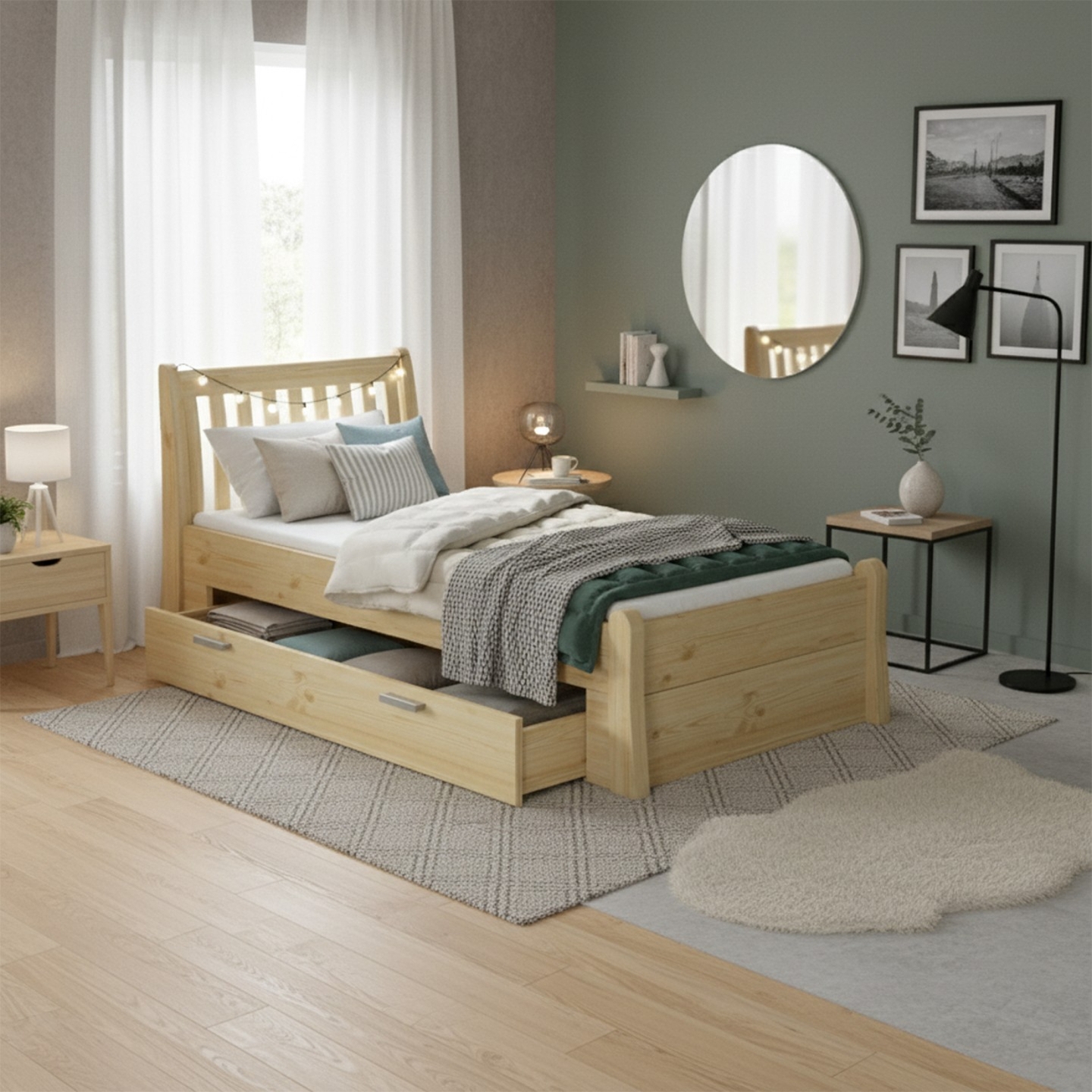 Uzupełnij swoje łóżko sosnowe Tonja 90x200 o praktyczną i pojemną Szufladę sosnową Tonja. Ten moduł to klucz do maksymalnego wykorzystania przestrzeni w mniejszych sypialniach, pokojach dziecięcych i młodzieżowych, gdzie liczy się każdy centymetr. W odróżnieniu od większych modeli, dla łóżek 90x200 i 120x200 szuflada jest pojedyncza, idealnie wpasowując się pod jedną stronę ramy. Wykonana z solidnego drewna sosnowego z eleganckim białym frontem, szuflada Tonja łączy naturalny urok drewna z nowoczesnym akcentem. To nie tylko estetyczne, ale przede wszystkim funkcjonalne rozwiązanie, które pozwala dyskretnie ukryć nadmiar rzeczy, zapewniając porządek. Szuflada na kółkach gwarantuje łatwe i ciche wysuwanie.