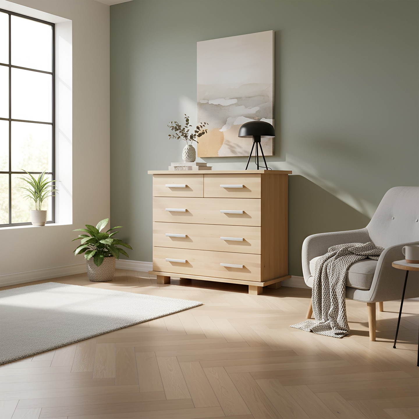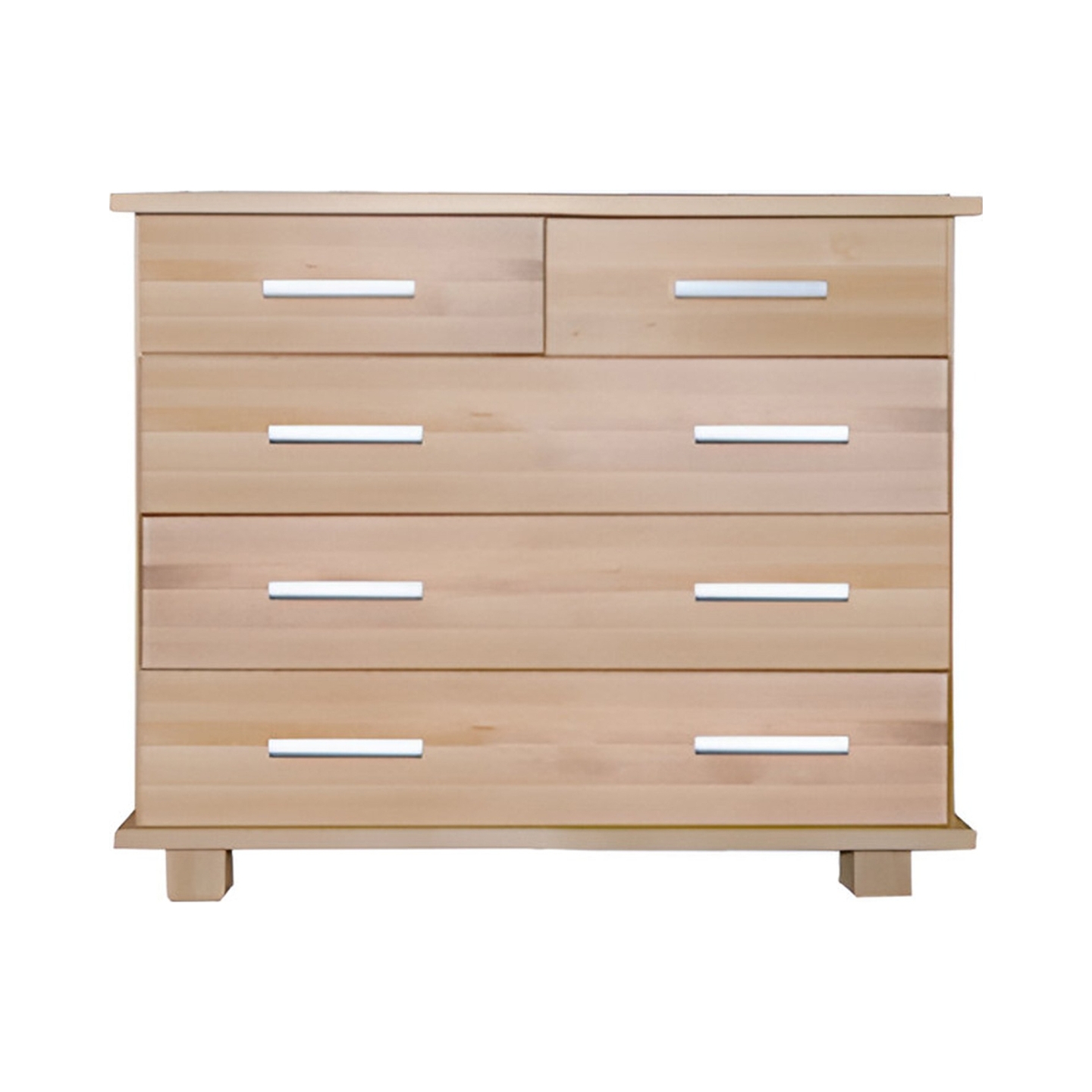 Kompaktowa komoda o szerokości 85 cm i wysokości 75 cm, wykonana w całości z twardego drewna bukowego. Jest to solidny i estetyczny mebel, wyposażony w pojemne szuflady. Idealnie sprawdzi się w sypialni, a jej wysokość ułatwia wykorzystanie górnego blatu.