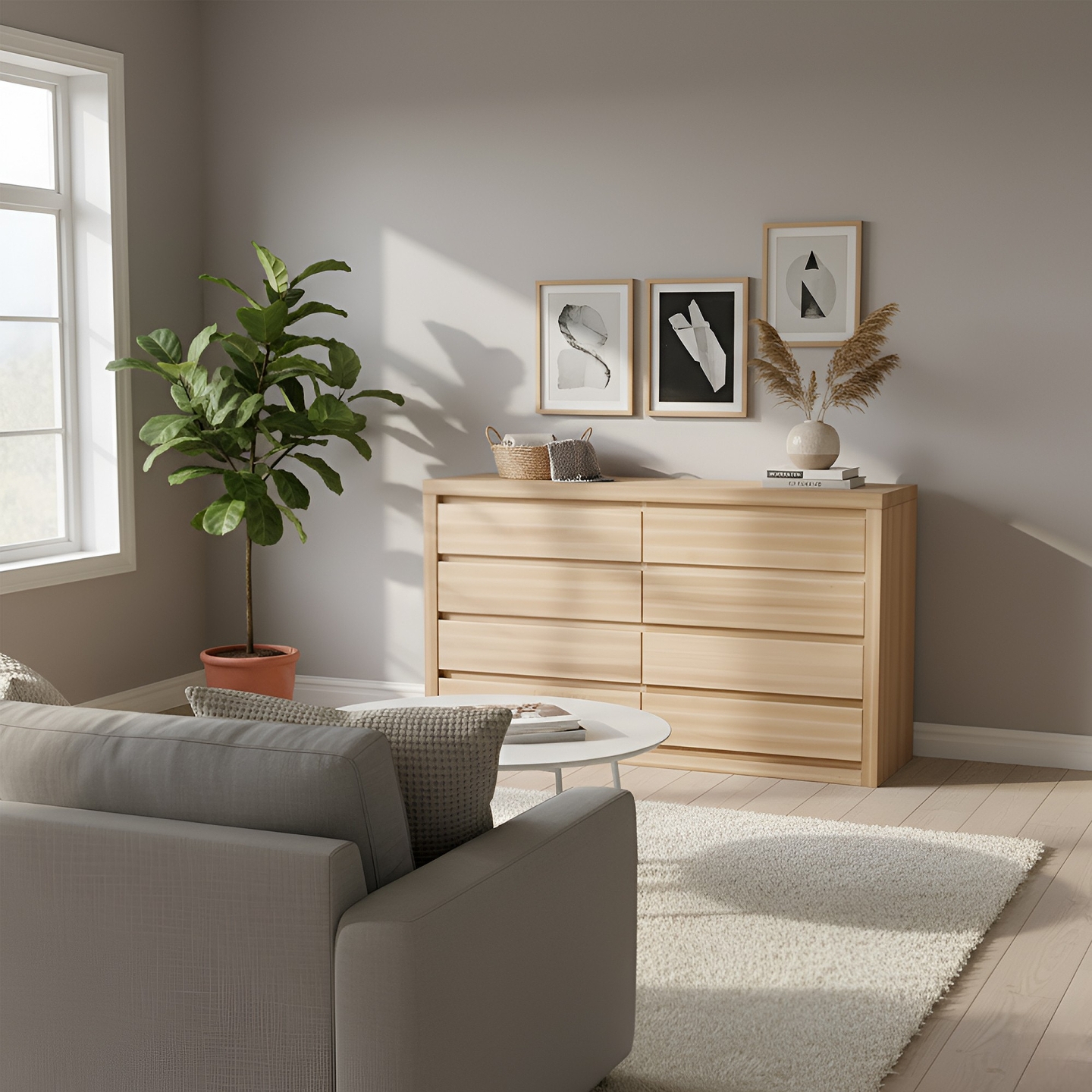 Szeroka i masywna komoda o długości 150 cm, wykonana w całości z twardego drewna bukowego. Pogrubiony korpus oraz nowoczesny, bezuchwytowy system otwierania (podcięcia na palce) nadają jej designerski i luksusowy charakter. Jest to solidny mebel na cokole, idealny do przechowywania w sypialni.