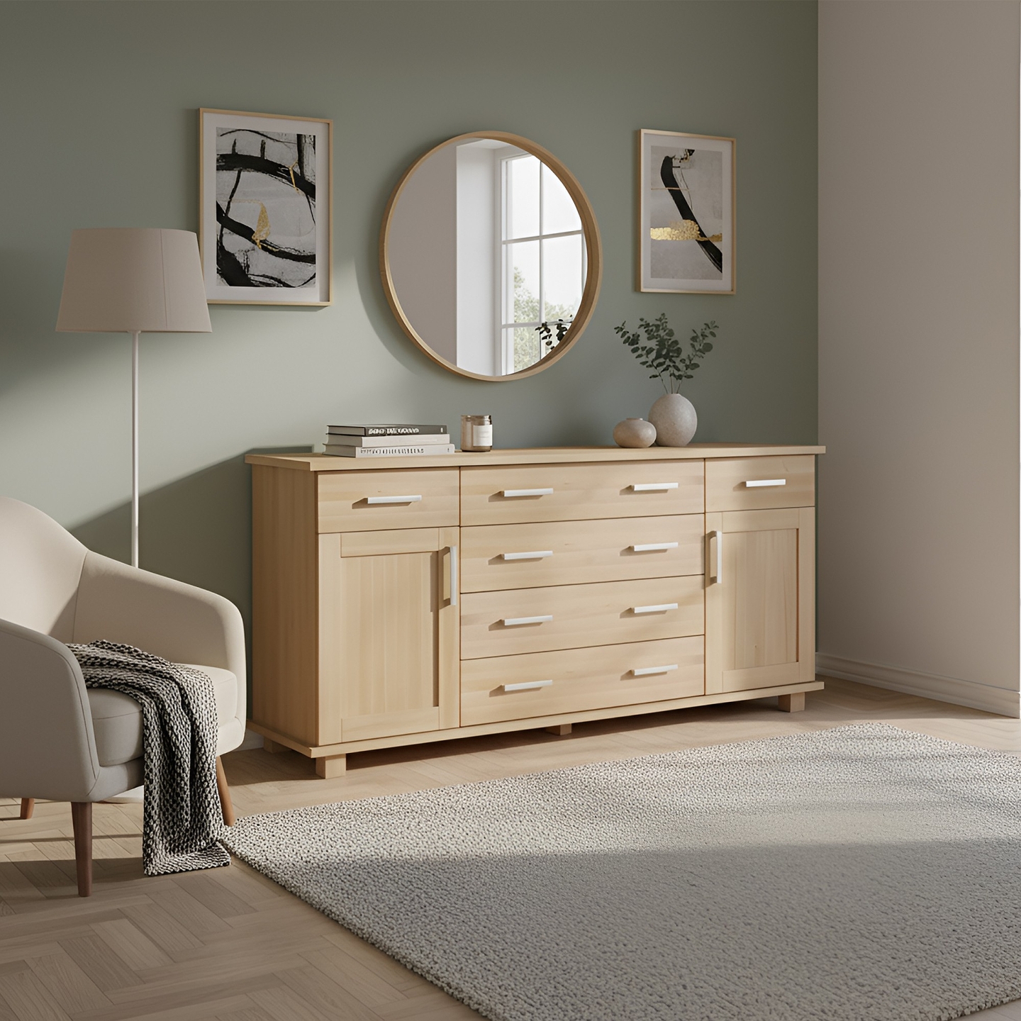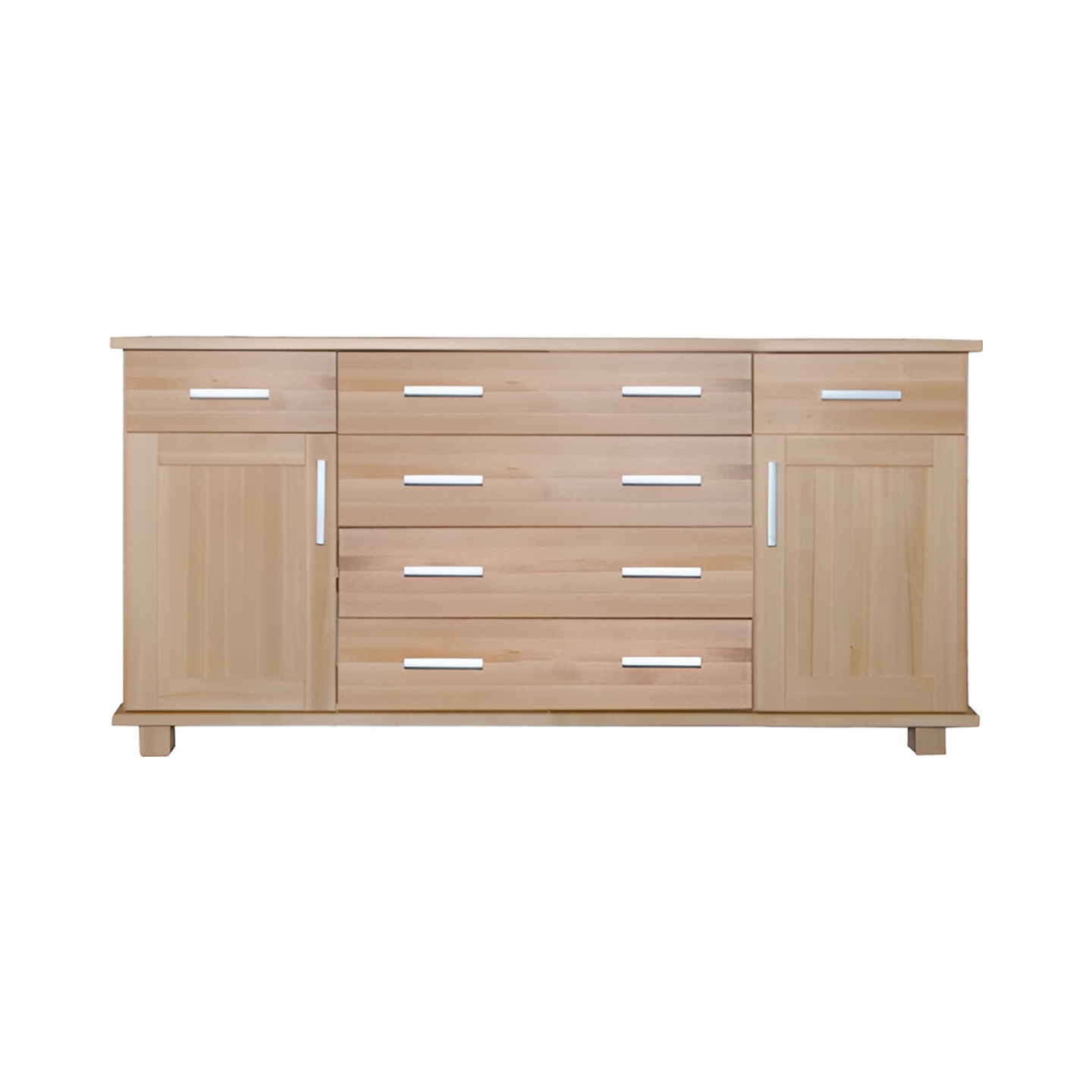 Bardzo szeroka komoda o długości 165 cm, wykonana w całości z twardego drewna bukowego. Jest to pojemny mebel, który doskonale sprawdzi się w sypialni, łącząc przestrzeń szuflad z zamykanymi szafkami. Wykończenie lakierem bezbarwnym podkreśla naturalną estetykę buczyny, a całość stoi na stabilnych, drewnianych nóżkach.