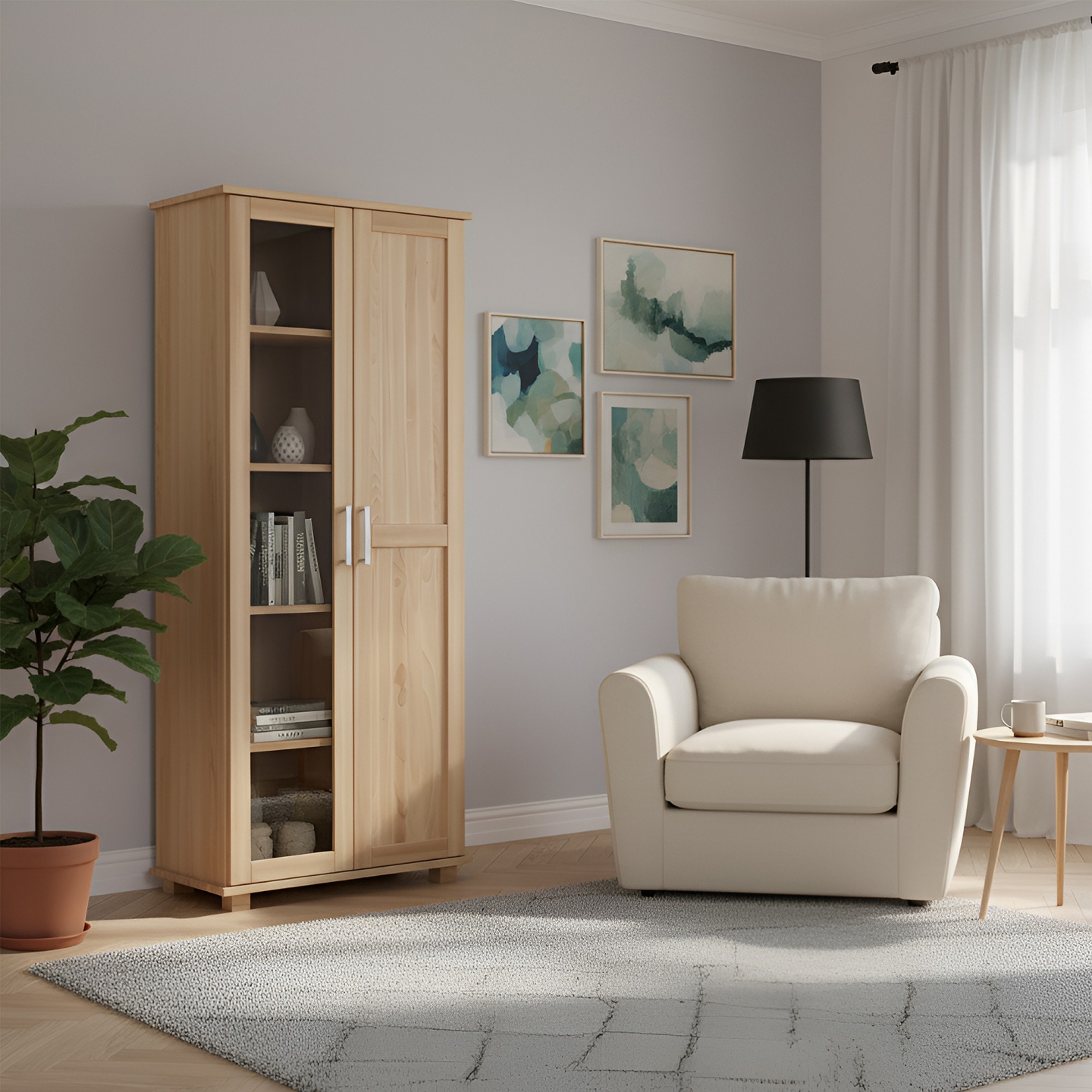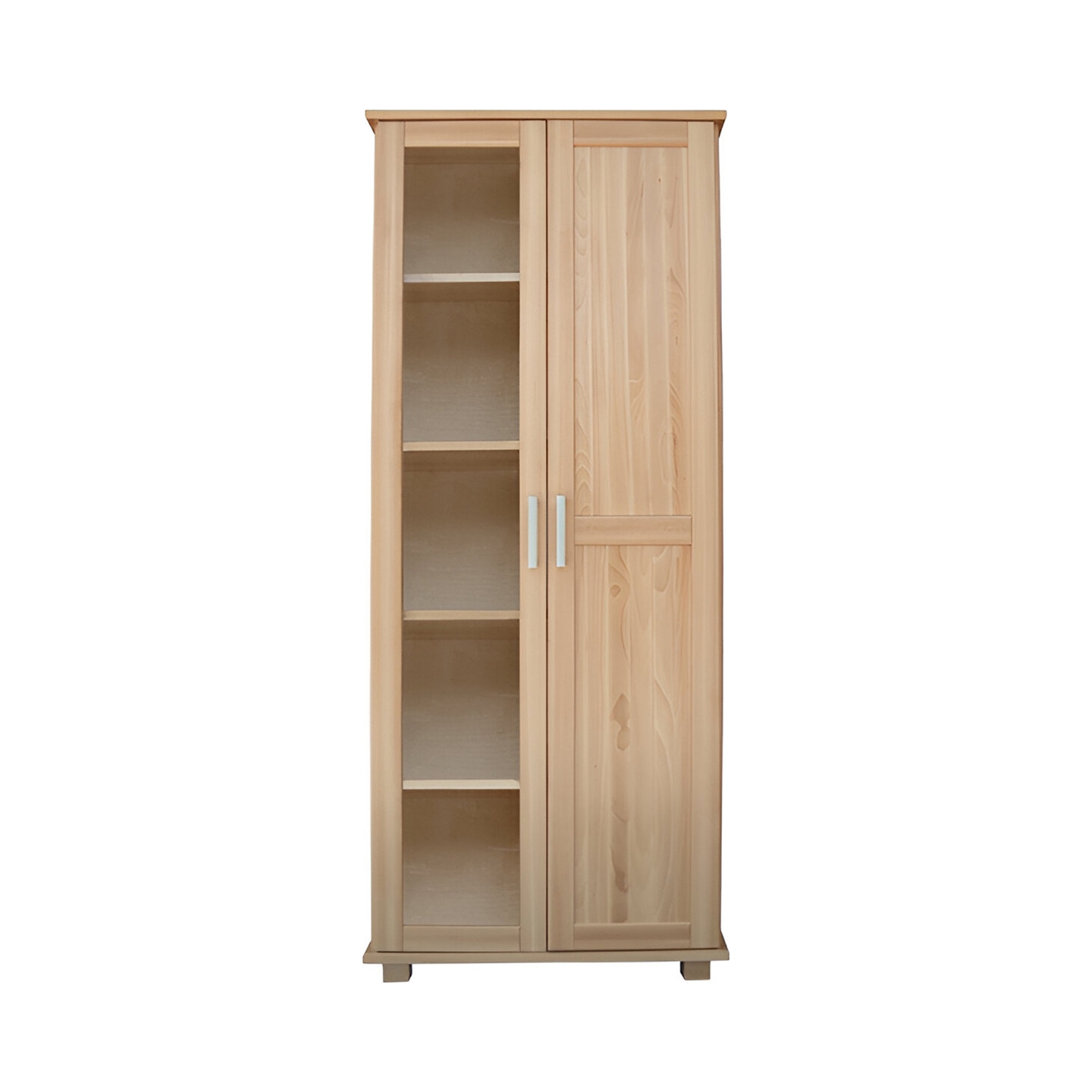 Elegancka, wysoka witryna o szerokości 80 cm, wykonana w całości z litego drewna bukowego. Jest to idealny mebel do pokoju dziennego, łączący funkcję przechowywania z ekspozycją dzięki przeszklonym elementom drzwi.