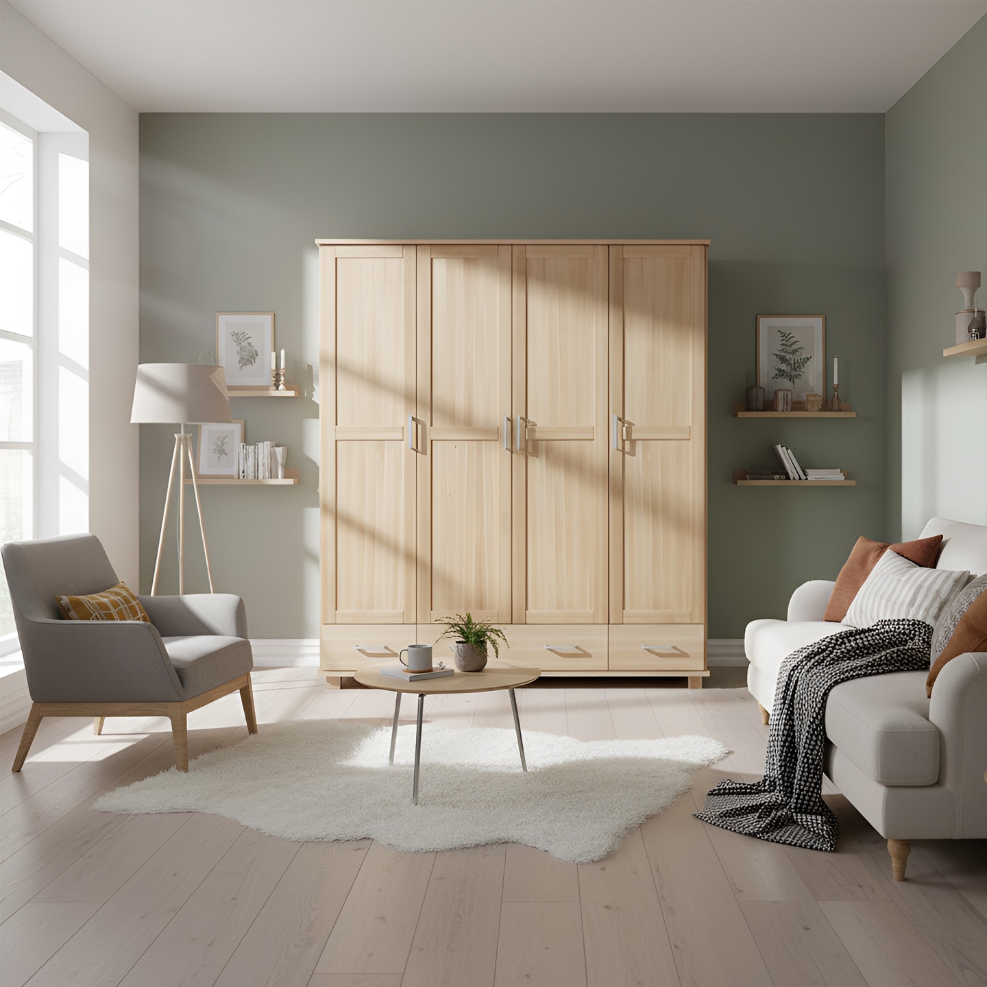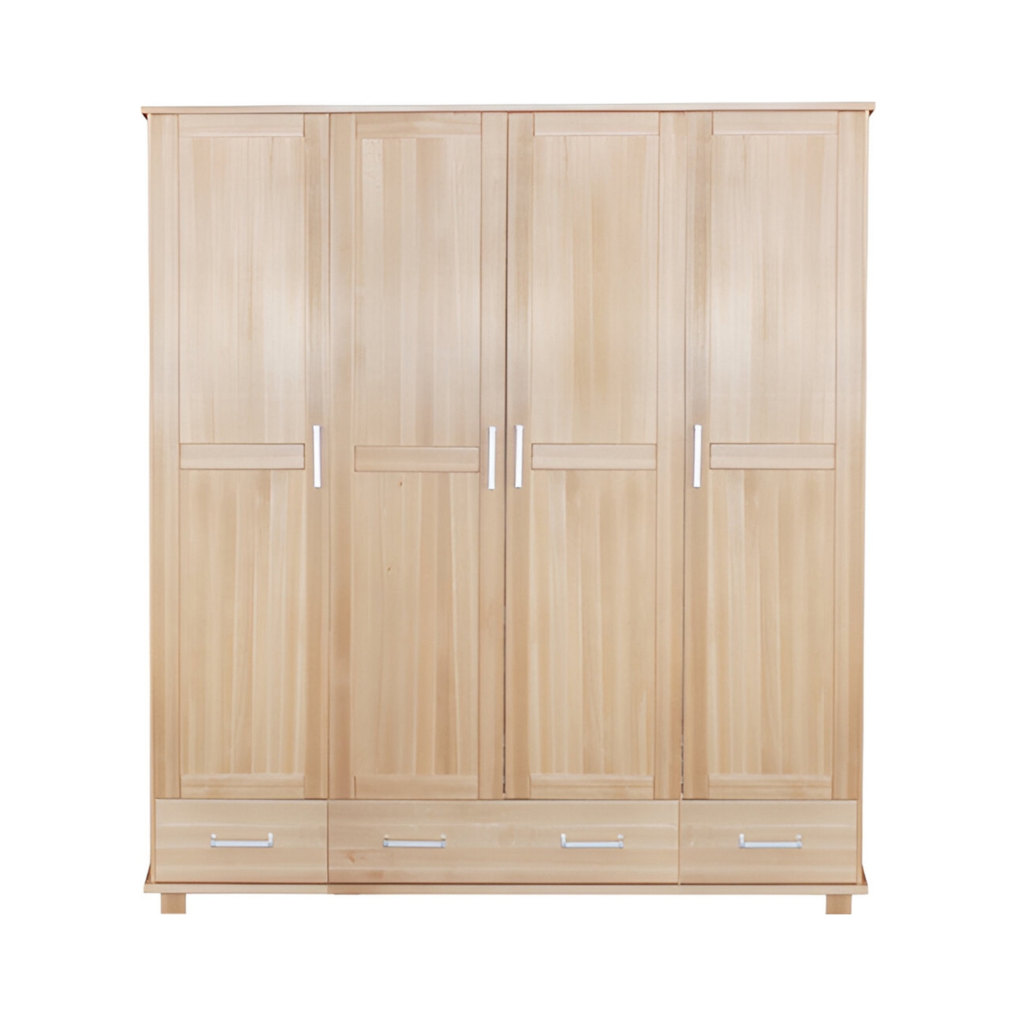 Bardzo pojemna i szeroka szafa o długości 165 cm, wykonana w całości z twardego drewna bukowego. To solidny i estetyczny mebel, który dzięki zróżnicowanemu wnętrzu zapewnia maksymalną organizację garderoby.