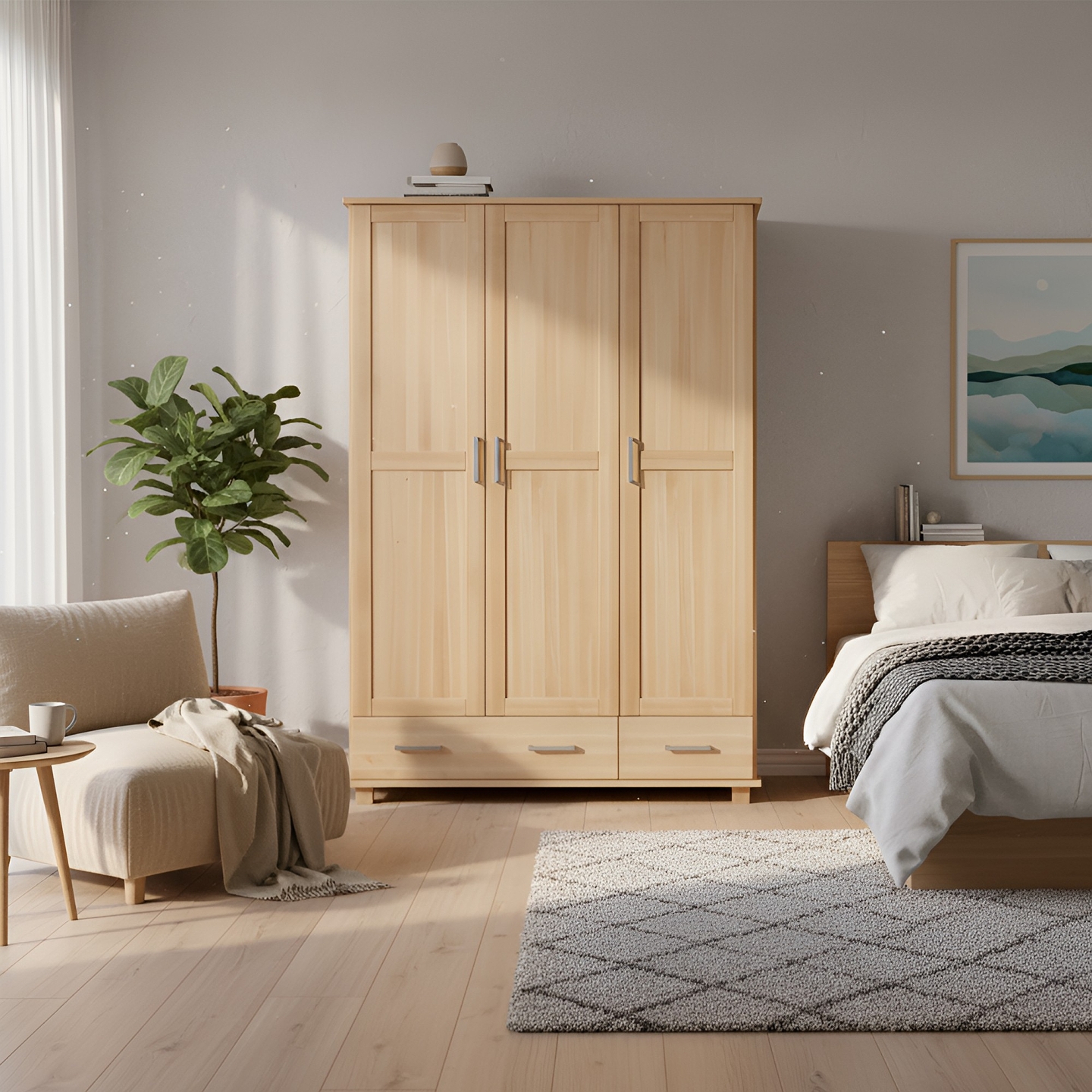 Duża, dwudrzwiowa szafa o szerokości 125 cm, wykonana w całości z twardego drewna bukowego, to solidne i pojemne rozwiązanie do każdej sypialni. Jej przemyślana konfiguracja wnętrza ułatwia organizację garderoby.