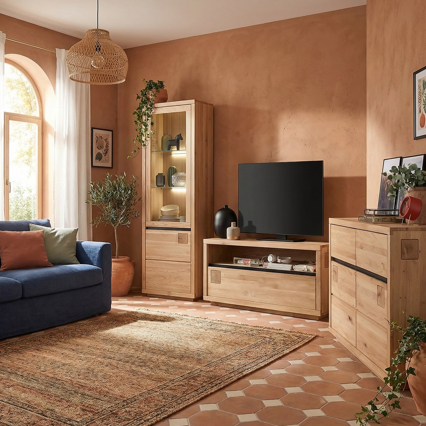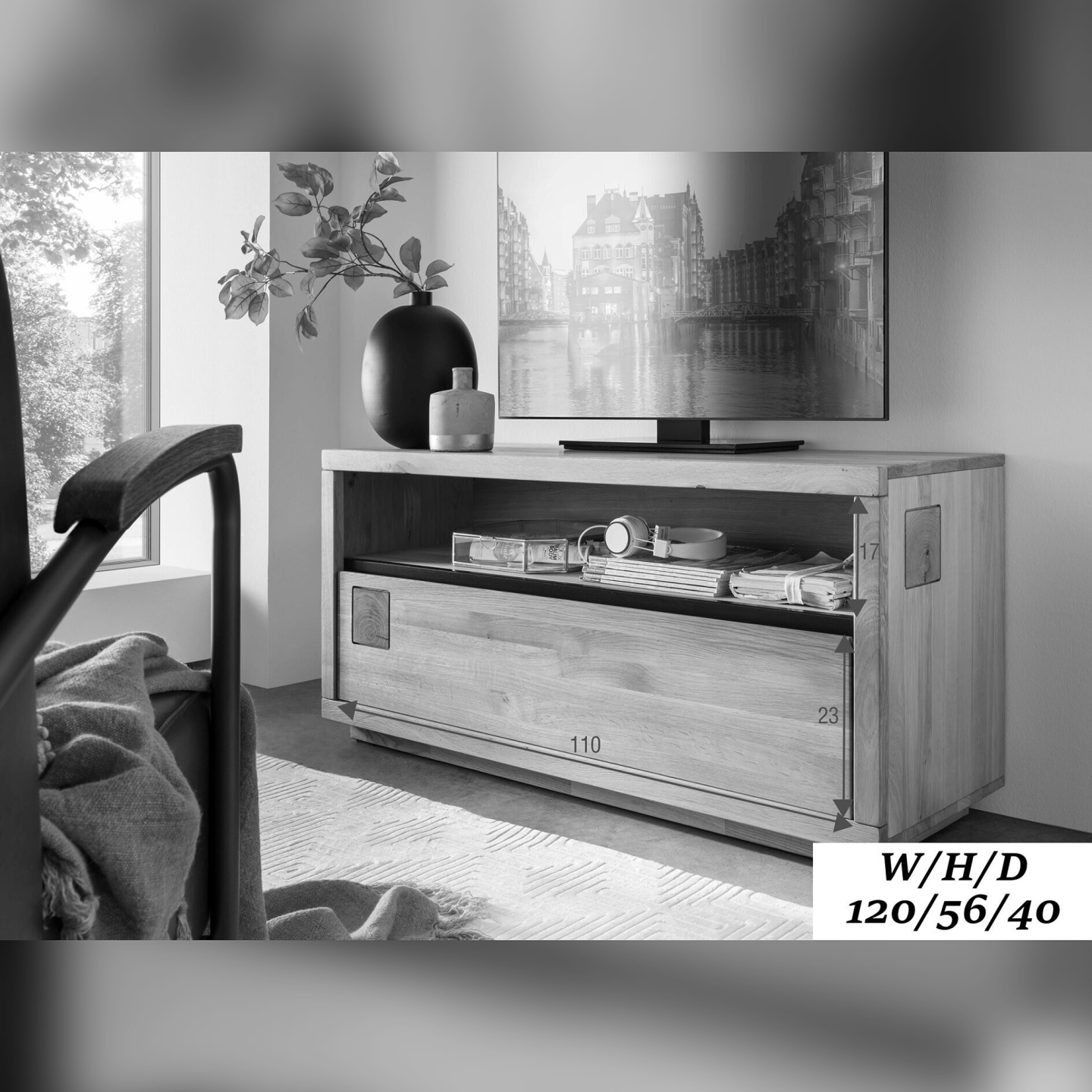 Wykończenie bezbarwnym, matowym olejem chroni powierzchnię przed śladami użytkowania i podkreśla rysunek dębowych słojów. Naturalny dąb w korpusie i frontach zapewnia dużą nośność. Szerokość 120 cm pozwala zmieścić dekoder, konsolę i akcesoria, jednocześnie zachowując porządek wokół telewizora.