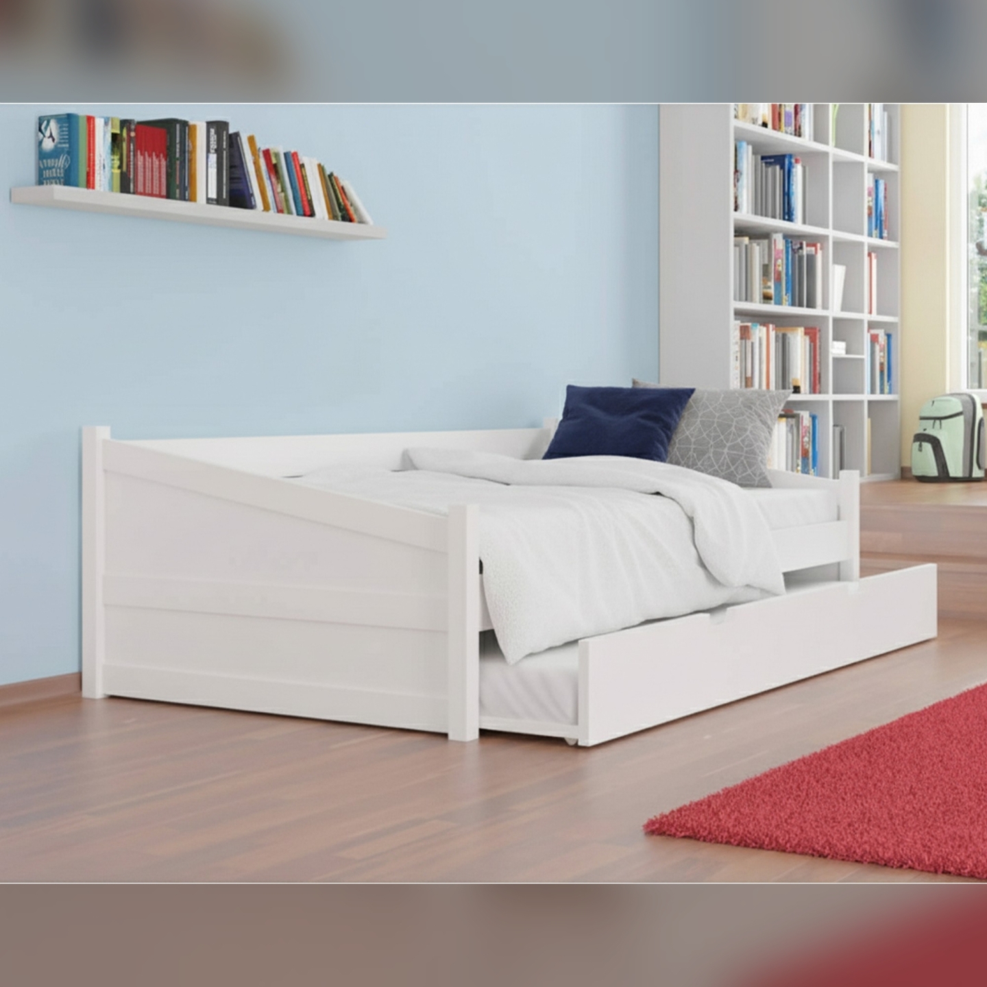 Prezentujemy funkcjonalne i estetyczne białe łóżko bukowe Anna 90x200, idealne rozwiązanie do pokoju młodzieżowego, dziecięcego lub niewielkiej sypialni. To solidny mebel, który łączy klasyczny design z praktycznym wykorzystaniem przestrzeni. Łóżko Anna wyróżnia się prostą, ale masywną konstrukcją wykonaną w całości z litego drewna bukowego twardzielowego, co gwarantuje wyjątkową trwałość i stabilność na lata. Kluczowym atutem jest wysuwana dolna szuflada, która pełni rolę dodatkowego miejsca do spania lub pojemnego schowka na pościel czy zabawki. Uniwersalny biały kolor nadaje meblowi lekkości i pozwala na łatwe wkomponowanie go zarówno w minimalistyczne, jak i nowoczesne aranżacje wnętrz. Widoczny na zdjęciu gotowy komplet (z zieloną pościelą) podkreśla potencjał łóżka jako komfortowej i estetycznej strefy relaksu.