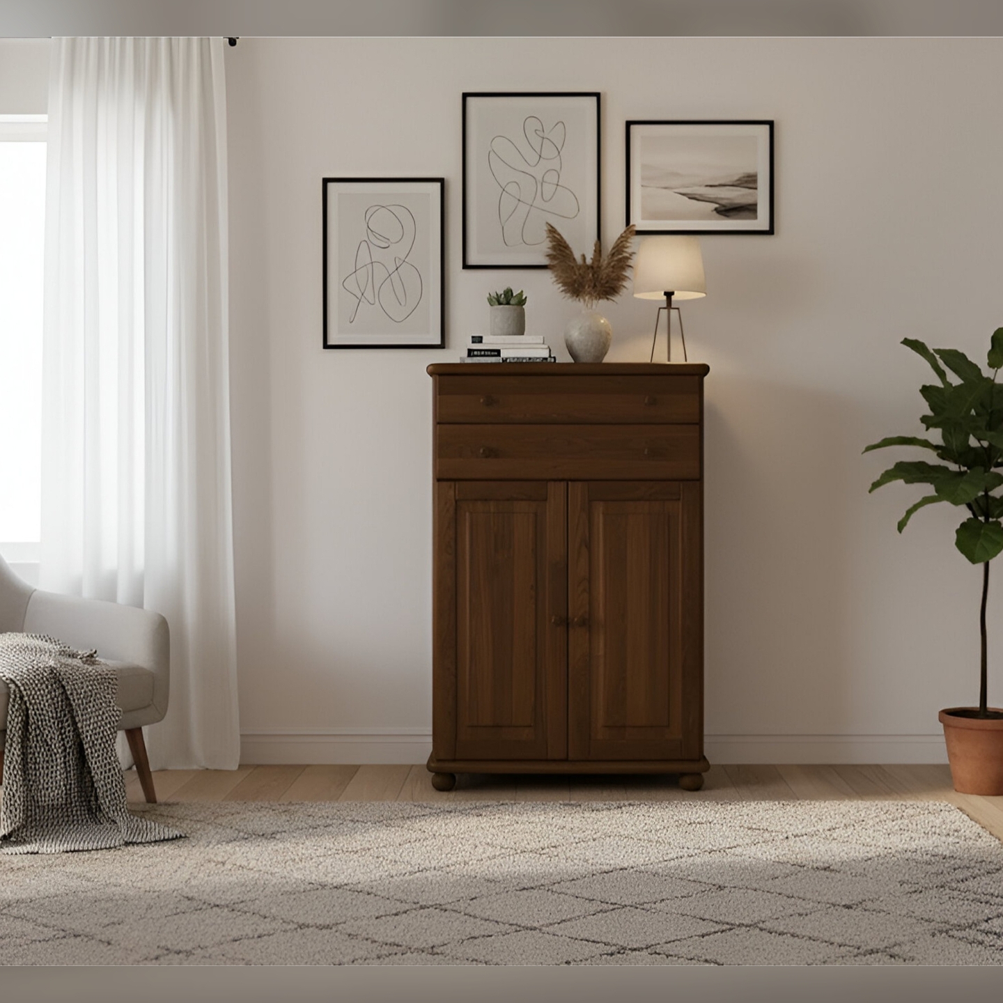 Szukasz kompaktowej, ale pojemnej komody drewnianej, która wniesie ciepło i naturalny styl do Twojego wnętrza? Ta solidna komoda sosnowa z drzwiami i szufladami to idealne połączenie funkcjonalności i estetyki. Mebel jest wykonany w całości z drewna sosnowego, z frontami z bezsęcznego materiału, co gwarantuje długowieczność. Wykończenie bejcą subtelnie zabezpiecza powierzchnię, jednocześnie w pełni eksponując piękny i autentyczny rysunek słojów. Przy wymiarach **85 cm szerokości** i **125 cm wysokości**, jest to optymalny mebel do sypialni, który maksymalizuje przestrzeń do przechowywania.