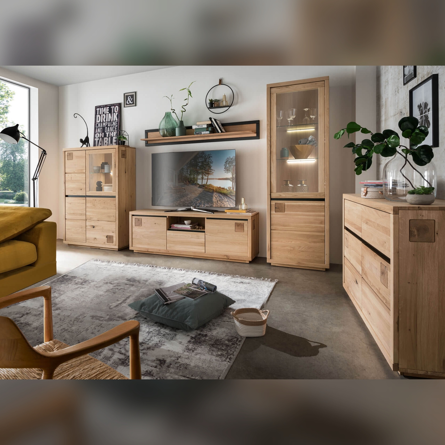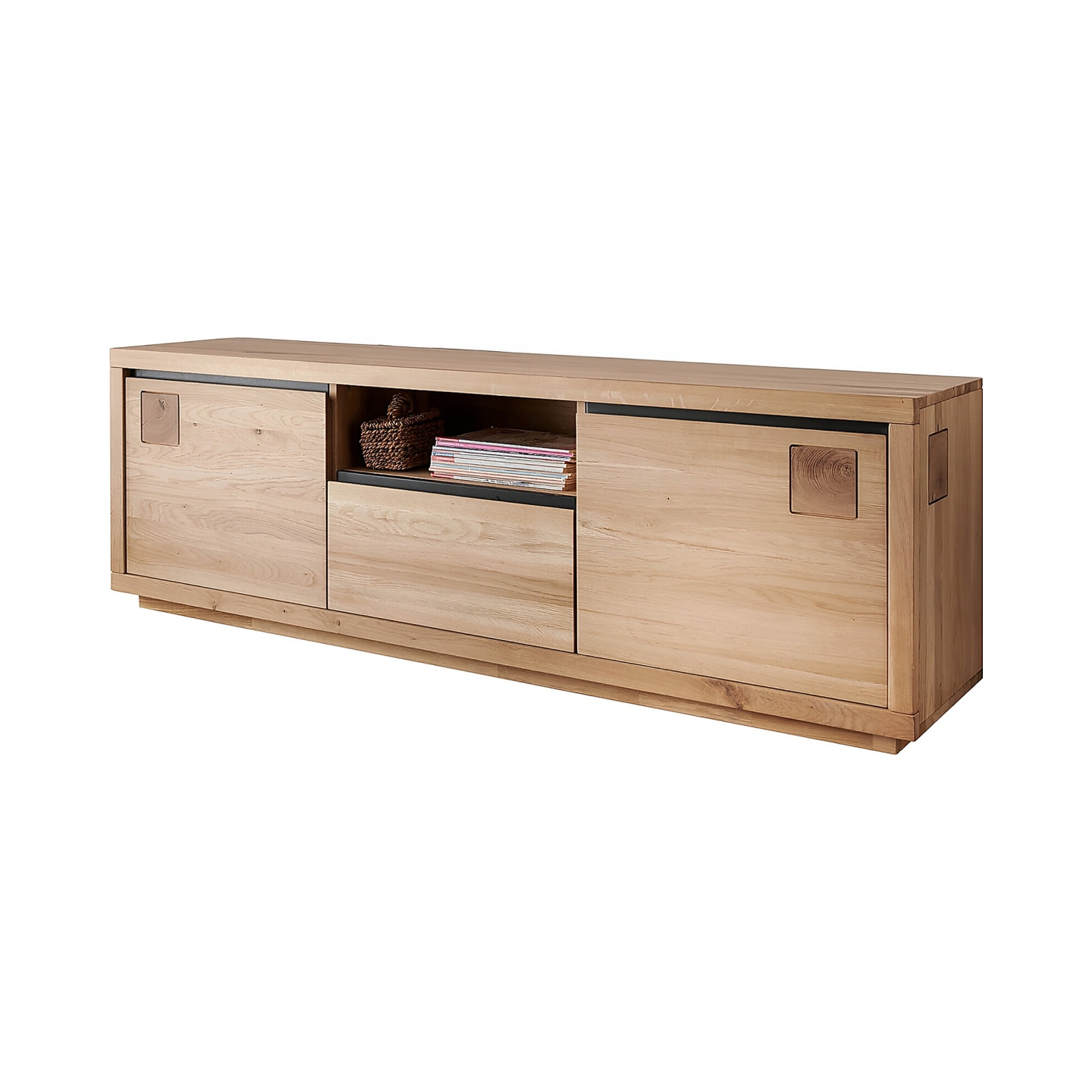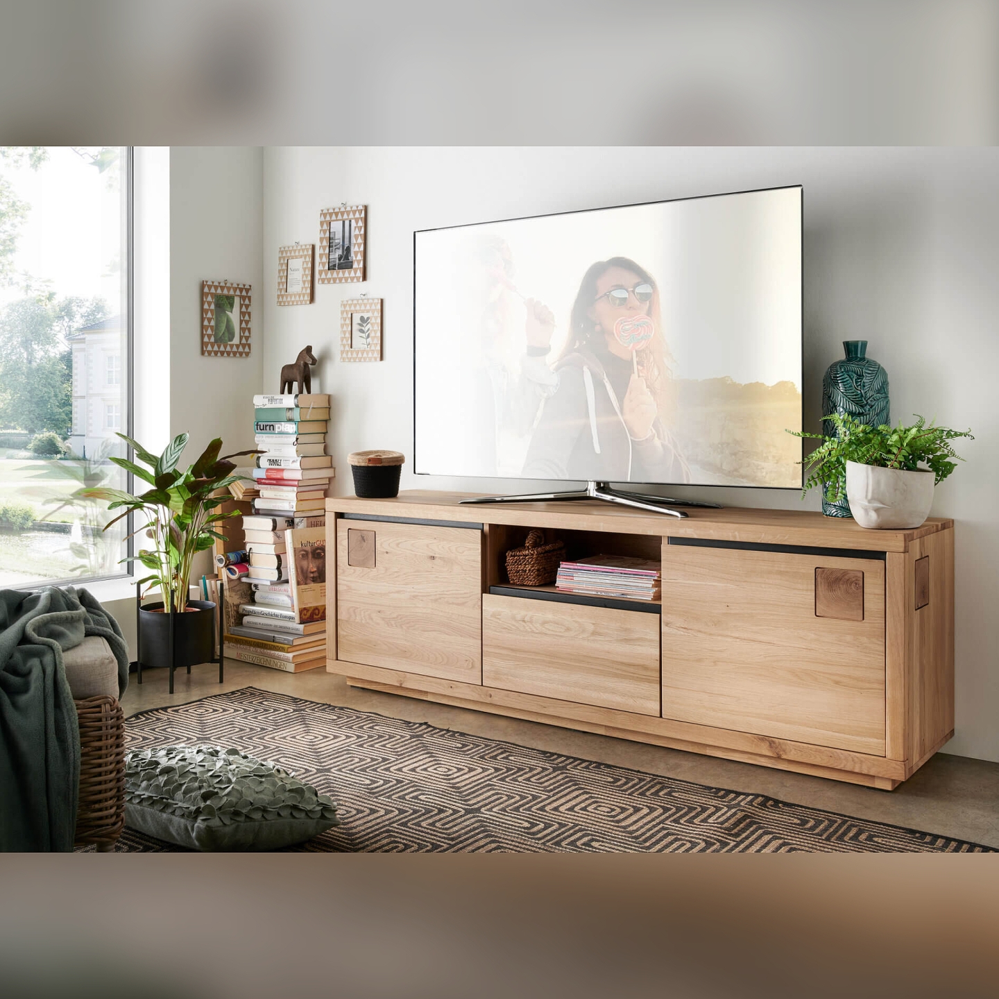 Szafka RTV II Fende to stabilny mebel z litego dębu, który bez problemu utrzyma duży telewizor i uporządkuje sprzęt RTV. Masywna konstrukcja i olejowane wykończenie zapewniają trwałość, a czarne wstawki dodają jej surowego, loftowego charakteru. To dobry wybór, jeśli szukasz gotowego, solidnego mebla bez konieczności samodzielnego składania.
