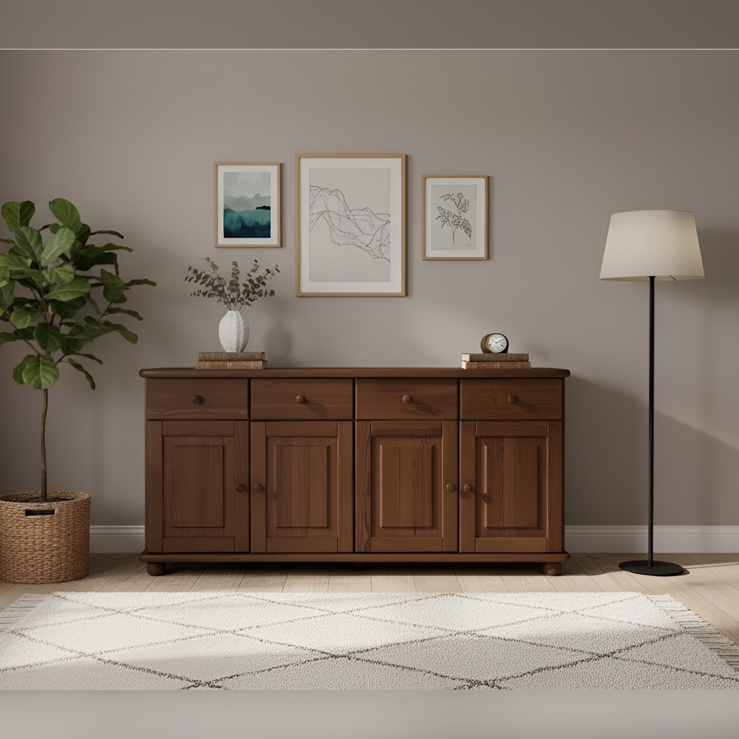 Szukasz szerokiej i solidnej komody drewnianej, która doskonale sprawdzi się jako szafka pod telewizor lub pojemny schowek w sypialni? Prezentujemy niską komodę sosnową z drzwiami i szufladami, której wykończenie bejcą pięknie eksponuje naturalny rysunek drewna. Mebel jest wykonany w całości z drewna sosnowego, z bezsęcznych frontów, co gwarantuje jego niezrównaną trwałość. Z imponującą szerokością 165 cm, komoda oferuje mnóstwo miejsca do przechowywania, jednocześnie zachowując niską wysokość (75 cm). Bejca zapewnia skuteczną ochronę powierzchni, zachowując przy tym autentyczny urok drewna.