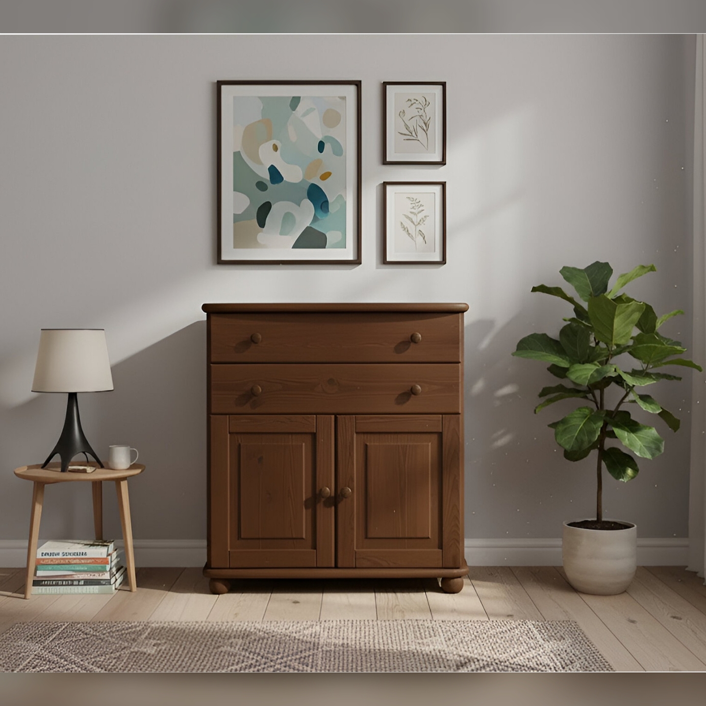 • Zróżnicowana pojemność: Komoda łączy pojemne szuflady na metalowych prowadnicach rolkowych oraz szafkę z drzwiami, za którymi znajduje się jedna solidna półka.