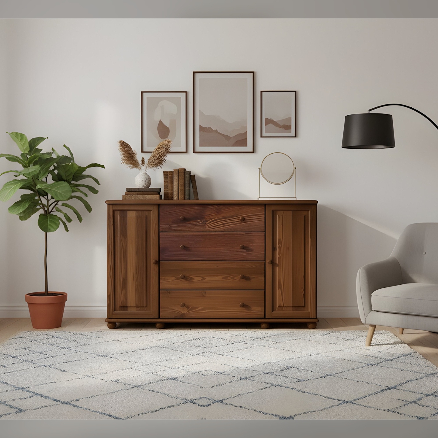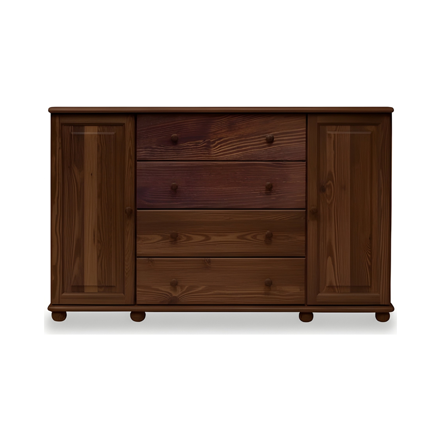 Szukasz wyjątkowo szerokiej i pojemnej komody drewnianej, która stanie się centralnym punktem Twojej sypialni lub salonu? Prezentujemy komodę sosnową z drzwiami i szufladami o imponującej szerokości 156 cm. Mebel jest wykonany w całości z drewna sosnowego, z bezsęcznych frontów, co gwarantuje jego niezawodną trwałość. Wykończenie bejcą doskonale zabezpiecza drewno, jednocześnie wydobywając jego naturalny, ciepły odcień. Z wysokością 100 cm, komoda oferuje zarówno komfortowy blat do ekspozycji, jak i maksymalną przestrzeń do przechowywania.