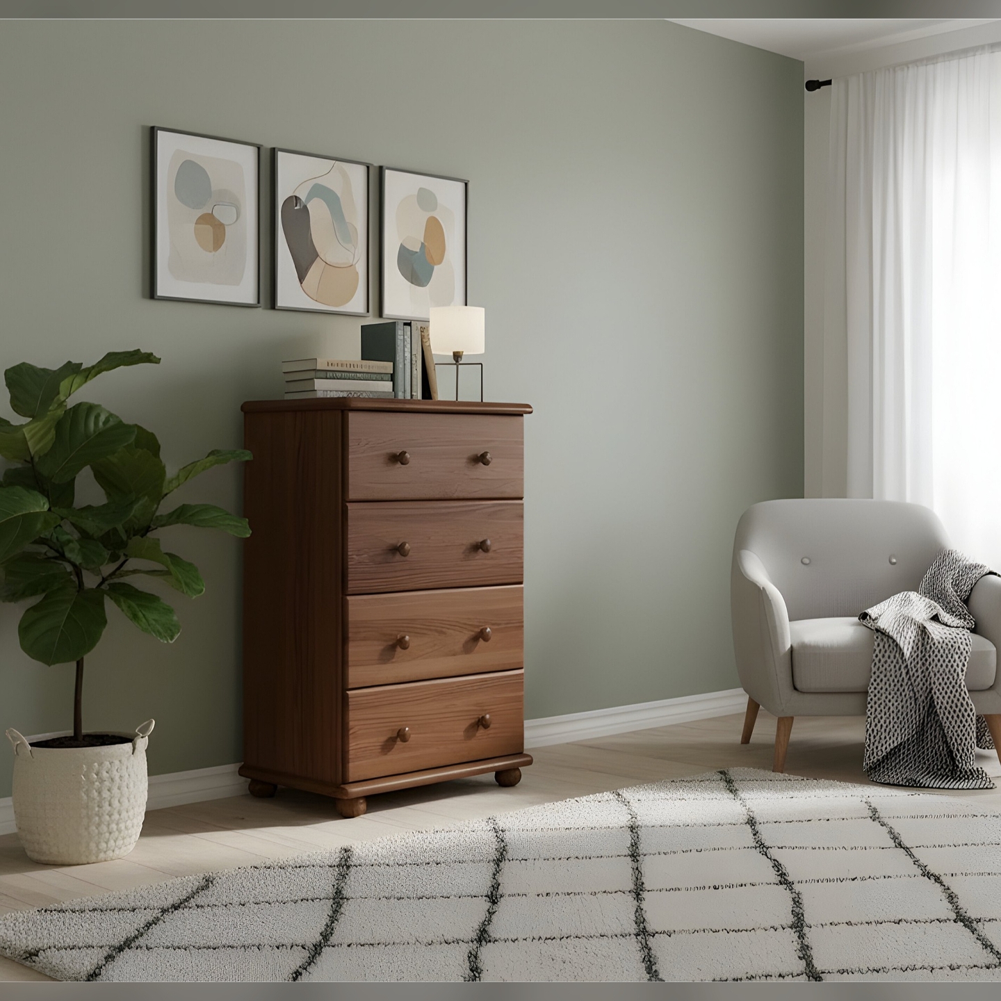 Ta drewniana komoda z szufladami to doskonały wybór dla osób ceniących sobie porządek, solidność i ponadczasową estetykę. Wysokość (100 cm) sprawia, że blat jest idealny do postawienia lustra lub wazonu. Konstrukcja z litego drewna sosnowego, wykończona bejcą, jest gwarancją trwałości i zdrowego mikroklimatu. Mebel jest dostarczany w paczkach, w elementach, wraz z kompletnym zestawem okuć i przejrzystą instrukcją do samodzielnego montażu. Postaw na polskie rzemiosło i ciesz się funkcjonalnością, którą oferuje ta piękna i pojemna komoda, zachowując naturalny i ponadczasowy wygląd drewna.