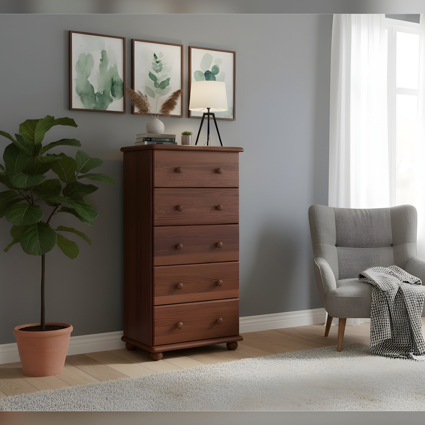 Ta drewniana komoda z szufladami to doskonały wybór dla osób ceniących sobie porządek, solidność i naturalne materiały. Konstrukcja z litego drewna sosnowego, wykończona bejcą, jest gwarancją trwałości i zdrowego mikroklimatu. Mebel jest dostarczany w paczkach, w elementach, wraz z kompletnym zestawem okuć i przejrzystą instrukcją do samodzielnego montażu. Postaw na polskie rzemiosło i ciesz się funkcjonalnością, którą oferuje ta piękna i pojemna komoda, zachowując naturalny i ponadczasowy wygląd drewna.