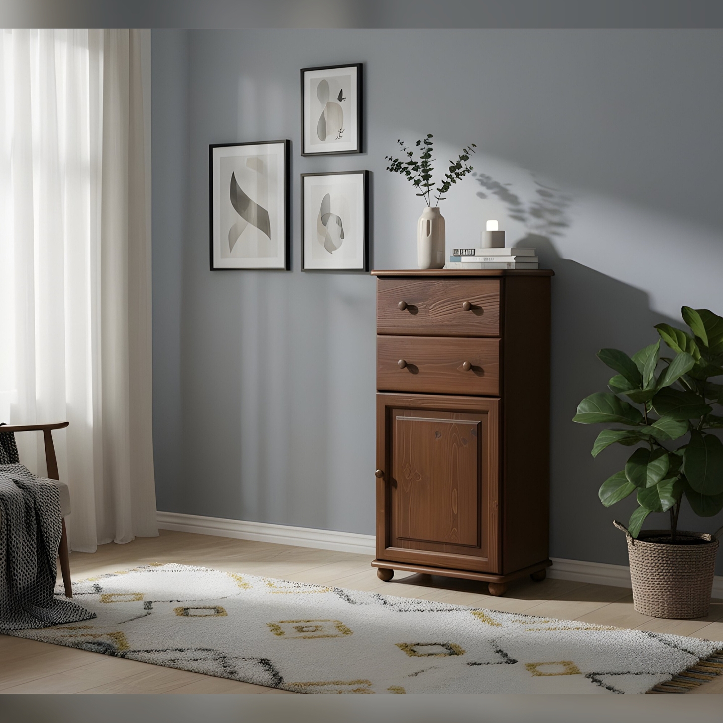 Ten drewniany słupek to doskonały wybór dla osób ceniących sobie porządek, solidność i naturalne materiały. Konstrukcja z litego drewna sosnowego, wykończona bejcą, jest gwarancją trwałości i zdrowego mikroklimatu. Mebel jest dostarczany w paczkach, w elementach, wraz z kompletnym zestawem okuć i przejrzystą instrukcją do samodzielnego montażu. Postaw na polskie rzemiosło i ciesz się funkcjonalnością, którą oferuje ta piękna i pojemna komoda, zachowując naturalny i ponadczasowy wygląd drewna.
