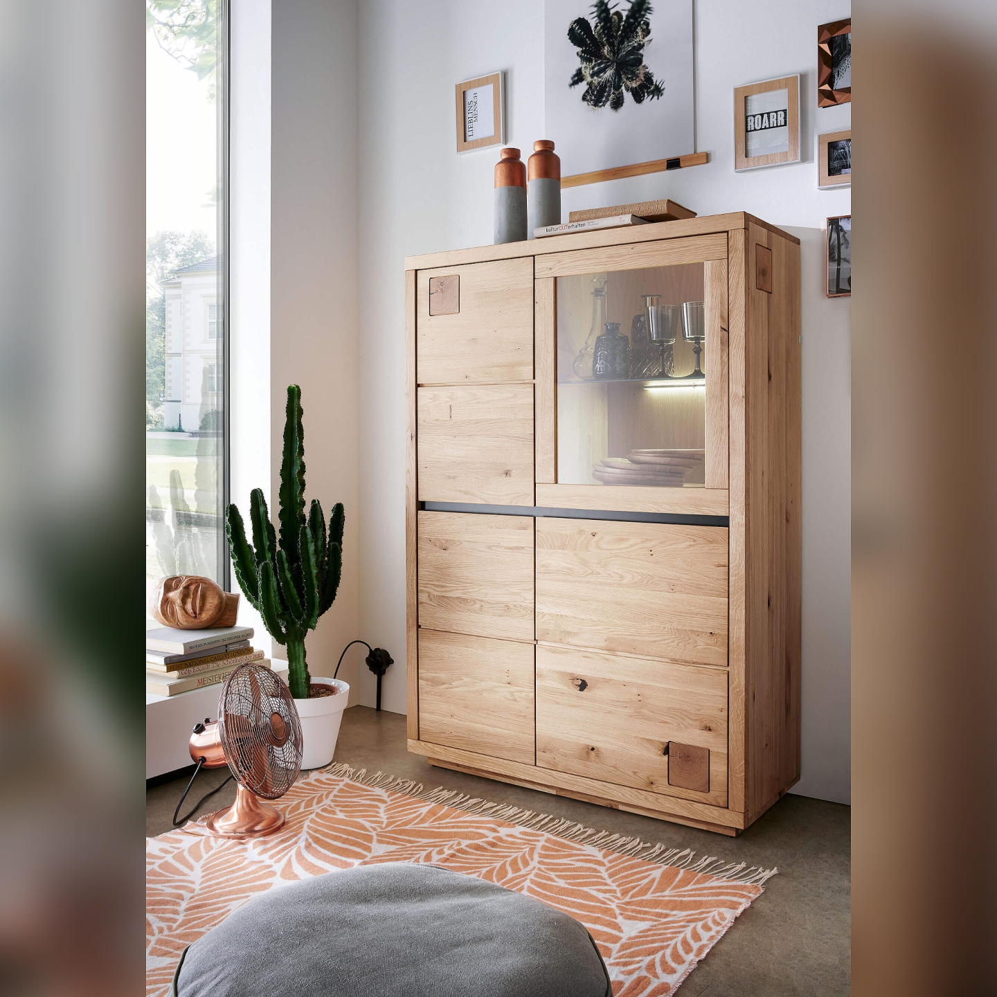 Wysokość 148 cm zapewnia dobrą pojemność bez przytłaczania pomieszczenia. Prawe ustawienie ułatwia łączenie kredensu z innymi elementami kolekcji Fende, zwłaszcza w układach symetrycznych. Mebel dostarczany jest w całości, więc od razu można z niego korzystać bez montowania i bez ryzyka poluzowania połączeń.