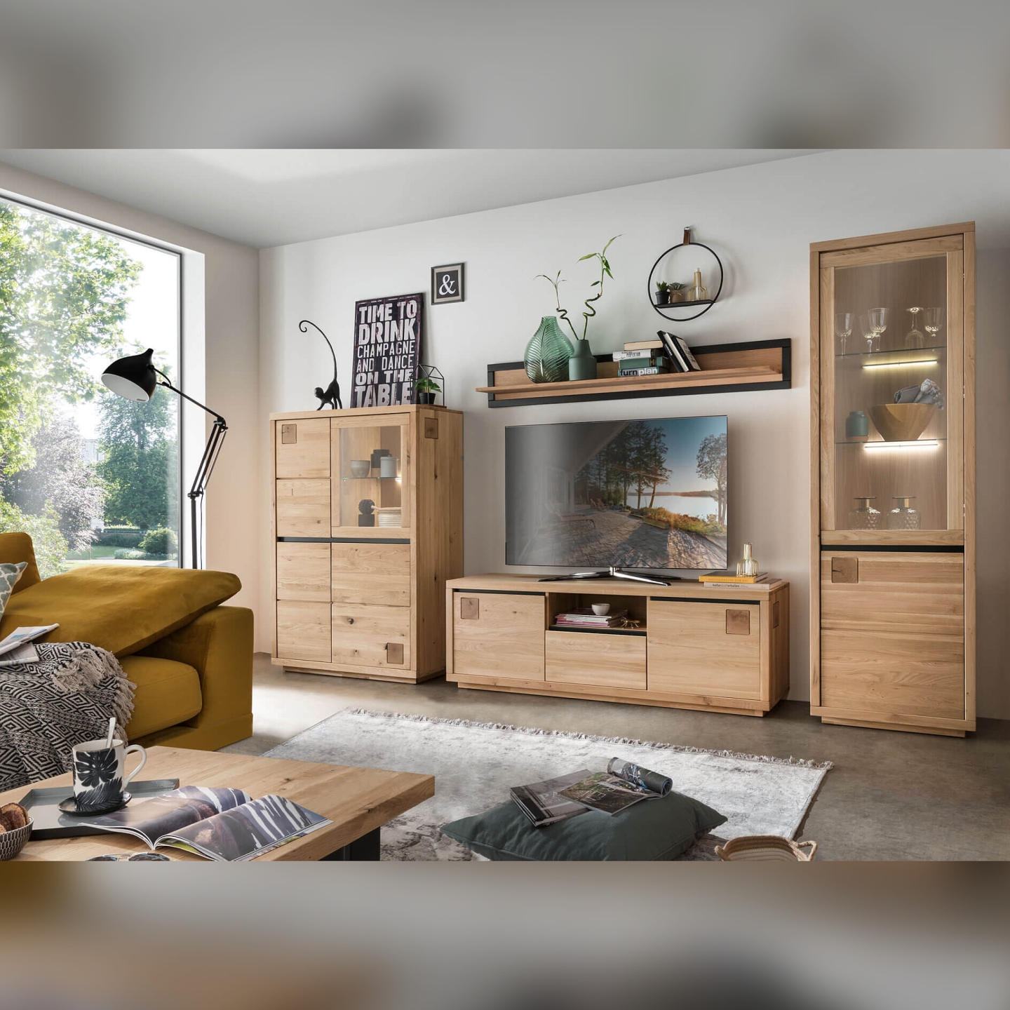 👉 Połączenie loftu i naturalnego drewna: czarne akcenty kontrastują z ciepłym dębem.