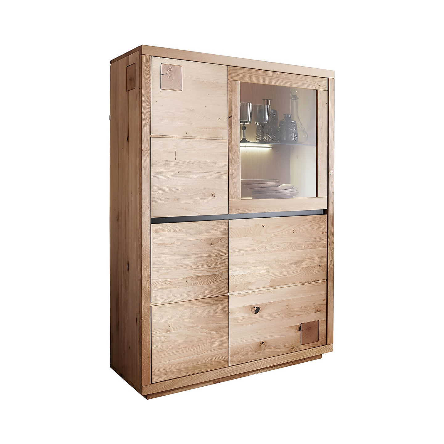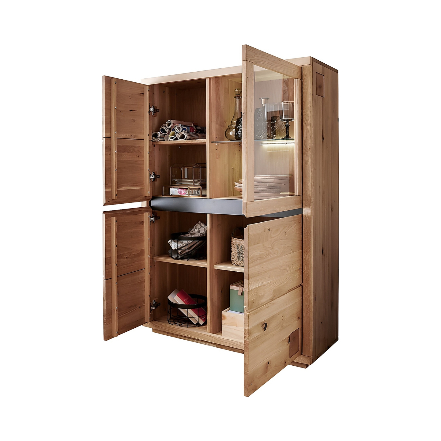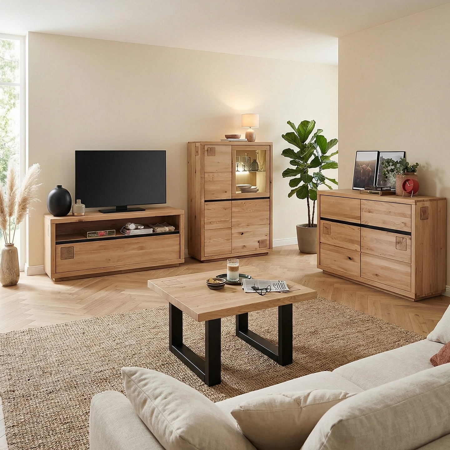 Korpus i fronty powstają wyłącznie z litego dębu, co daje twardość i sztywność, której nie zapewniają płyty kompozytowe. Powierzchnia jest olejowana bezbarwnie, dzięki czemu łatwo usunąć drobne zabrudzenia, a rysunek drewna pozostaje wyraźny. Waga 71,5 kg pokazuje masywną budowę i stabilność całego mebla.