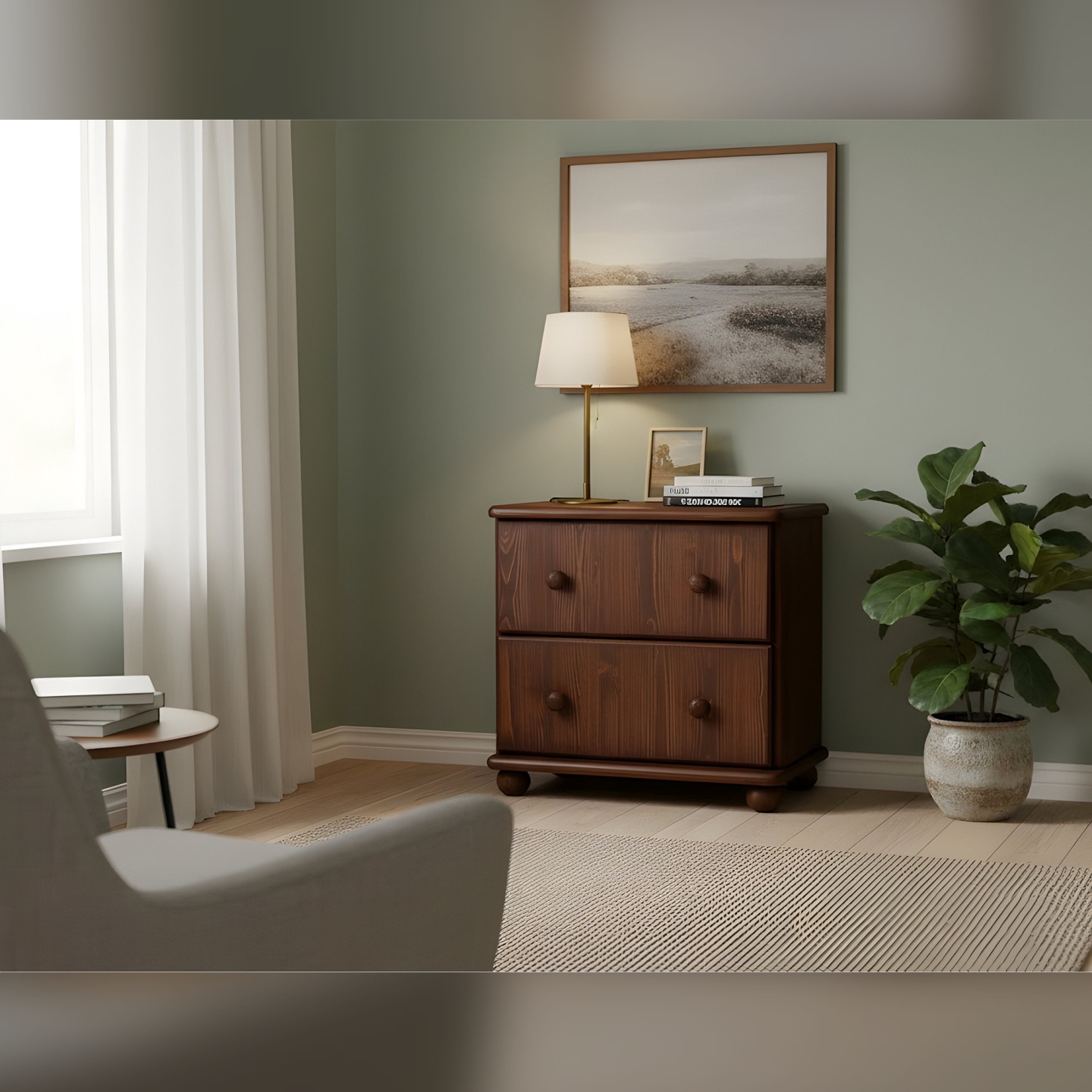 Szukasz kompaktowej i solidnej szafki nocnej lub małej komody drewnianej? Prezentujemy szafkę sosnową z szufladami, idealną do sypialni. Mebel ten został wykończony bejcą, który doskonale zabezpiecza drewno, jednocześnie eksponując jego naturalny, ciepły odcień. Komoda jest wykonana w całości z drewna sosnowego, z bezsęcznych frontów, co gwarantuje jej niezawodną trwałość. Z wymiarami 55 cm szerokości i 55 cm wysokości, jest to doskonały element uzupełniający.