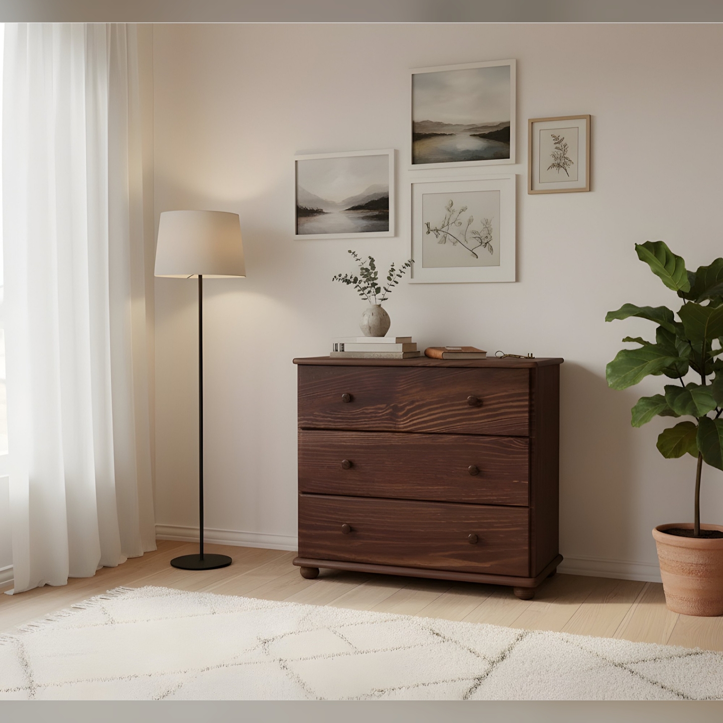 Ta drewniana komoda z szufladami to doskonały wybór dla osób ceniących sobie porządek, solidność i ponadczasową estetykę. Konstrukcja z litego drewna sosnowego, wykończona bejcą, jest gwarancją trwałości i zdrowego mikroklimatu. Mebel jest dostarczany w paczkach, w elementach, wraz z kompletnym zestawem okuć i przejrzystą instrukcją do samodzielnego montażu. Postaw na polskie rzemiosło i ciesz się funkcjonalnością, którą oferuje ta piękna i pojemna komoda, zachowując naturalny i ponadczasowy wygląd drewna.
