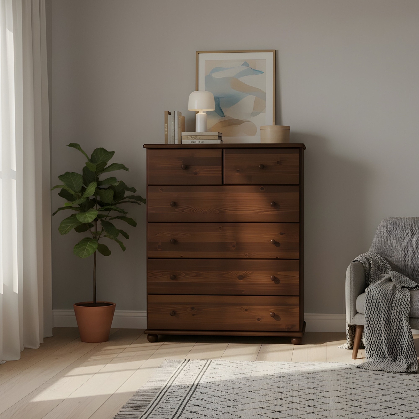 Ta drewniana komoda to doskonały wybór dla osób ceniących sobie solidność, naturalne materiały i przemyślaną organizację. Konstrukcja z litego drewna sosnowego, wykończona bejcą, jest gwarancją trwałości i zdrowego mikroklimatu. Mebel jest dostarczany w paczkach, w elementach, wraz z kompletnym zestawem okuć i przejrzystą instrukcją do samodzielnego montażu. Postaw na polskie rzemiosło i ciesz się pojemnością, którą oferuje ta piękna i pojemna komoda.