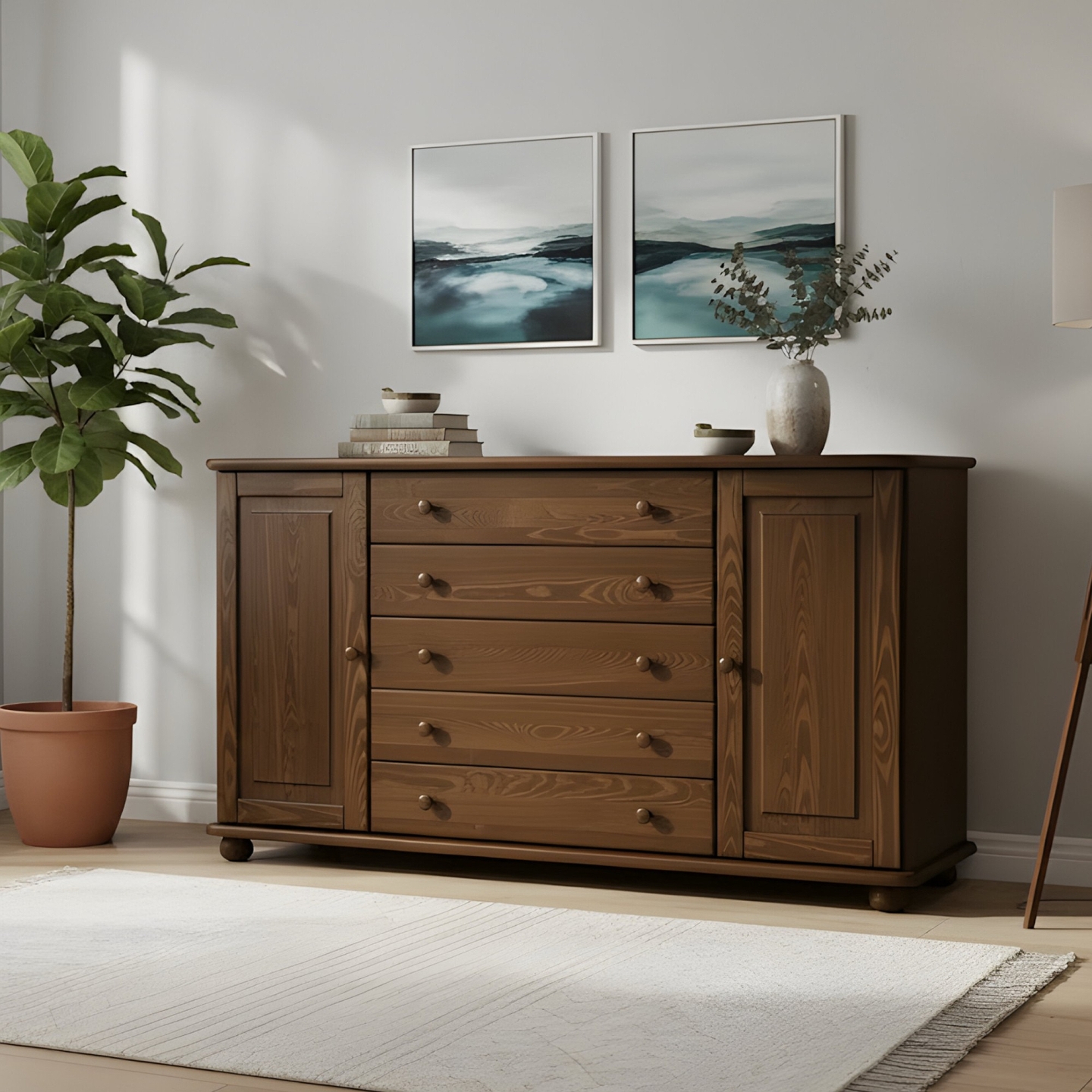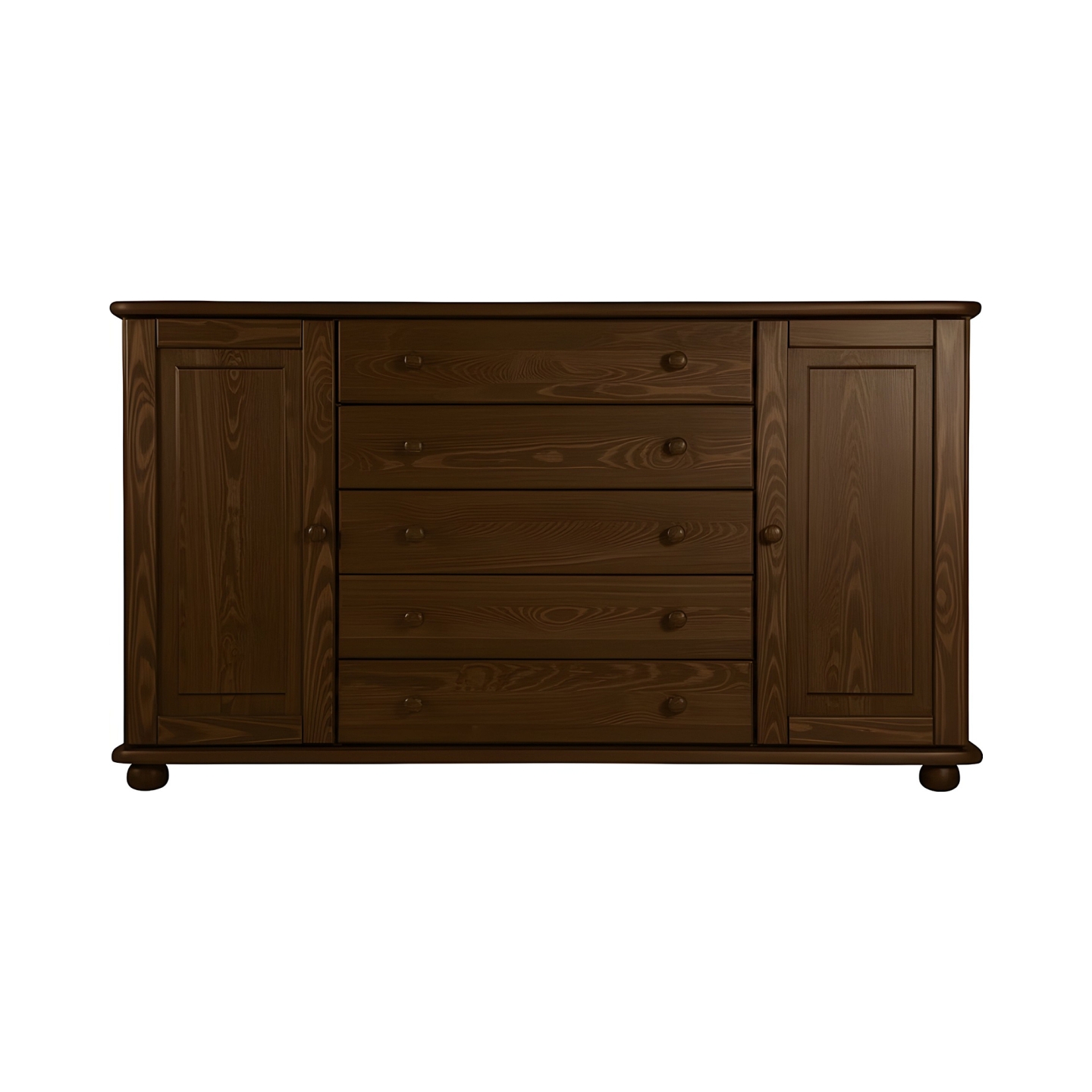 Szukasz ekstremalnie szerokiej i pojemnej komody drewnianej, która stanie się centralnym punktem Twojego salonu lub sypialni? Prezentujemy bardzo szeroką komodę sosnową o długości 165 cm, która harmonijnie łączy szuflady i zamykane szafki. Mebel ten został wykonany w całości z litego drewna sosnowego, wykończonego bejcą.