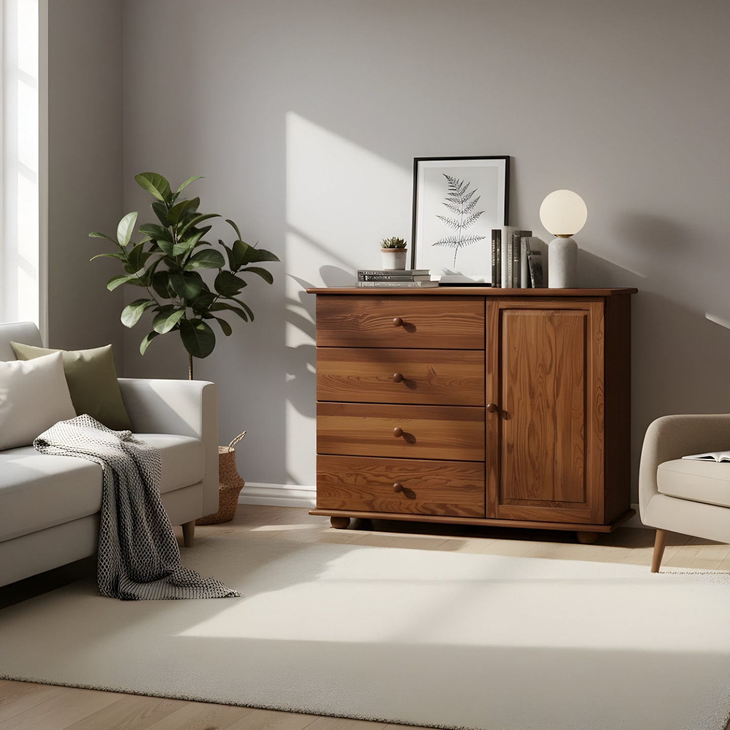 Ta drewniana komoda to doskonały wybór dla osób ceniących sobie solidność, naturalne materiały i przemyślaną organizację. Konstrukcja z litego drewna sosnowego, wykończona, jest gwarancją trwałości i zdrowego mikroklimatu. Mebel jest dostarczany w paczkach, w elementach, wraz z kompletnym zestawem okuć i przejrzystą instrukcją do samodzielnego montażu. Postaw na polskie rzemiosło i ciesz się pojemnością, którą oferuje ta piękna i szeroka komoda.