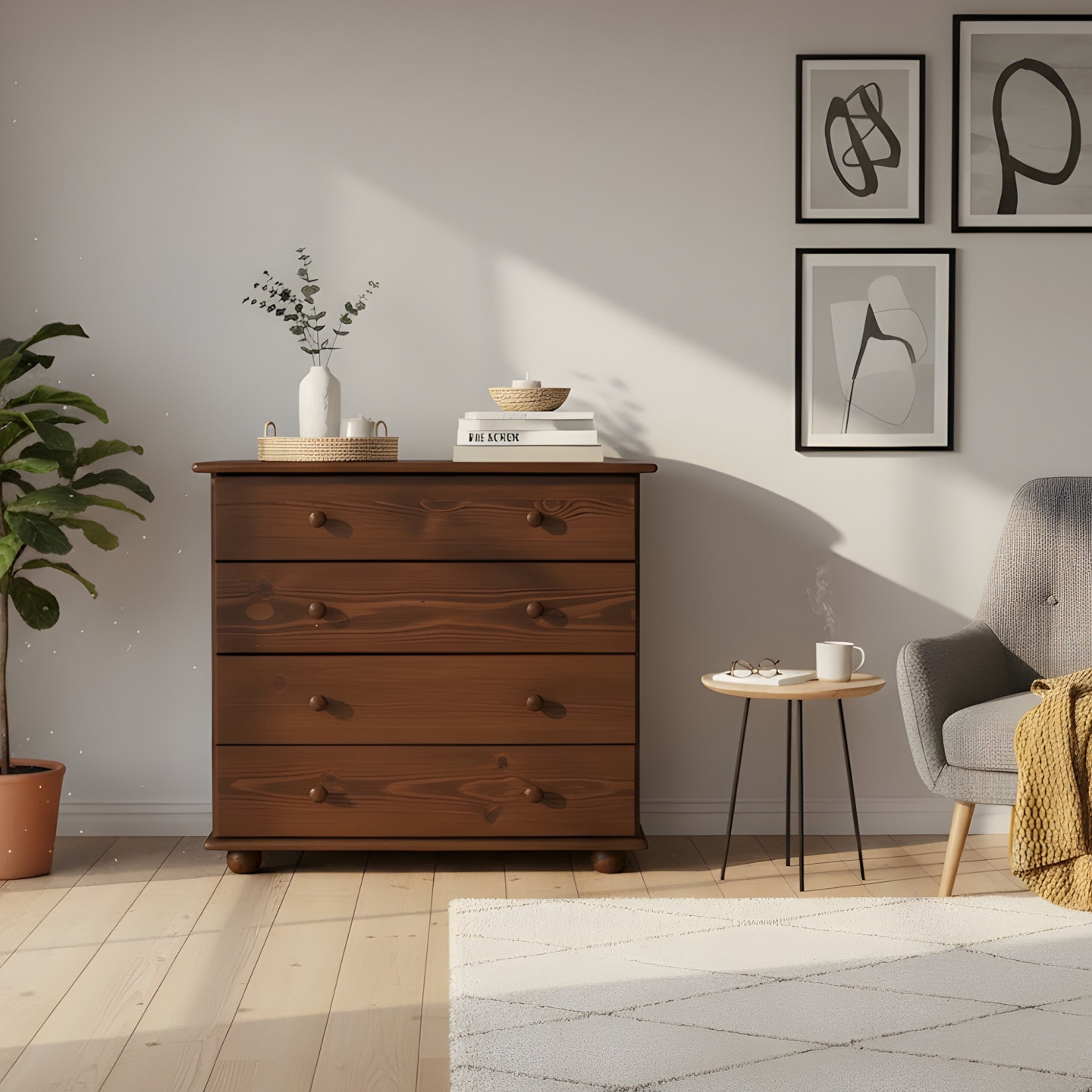 Szukasz solidnej i pojemnej komody drewnianej, która pomoże Ci uporządkować dużą ilość ubrań i bielizny? Prezentujemy sosnową komodę z szufladami o szerokości 93 cm i głębokości 47 cm, wykonaną w całości z litego drewna sosnowego, wykończonego bejcą. Klasyczny design i naturalny materiał sprawiają, że idealnie wpasuje się w każdą sypialnię.