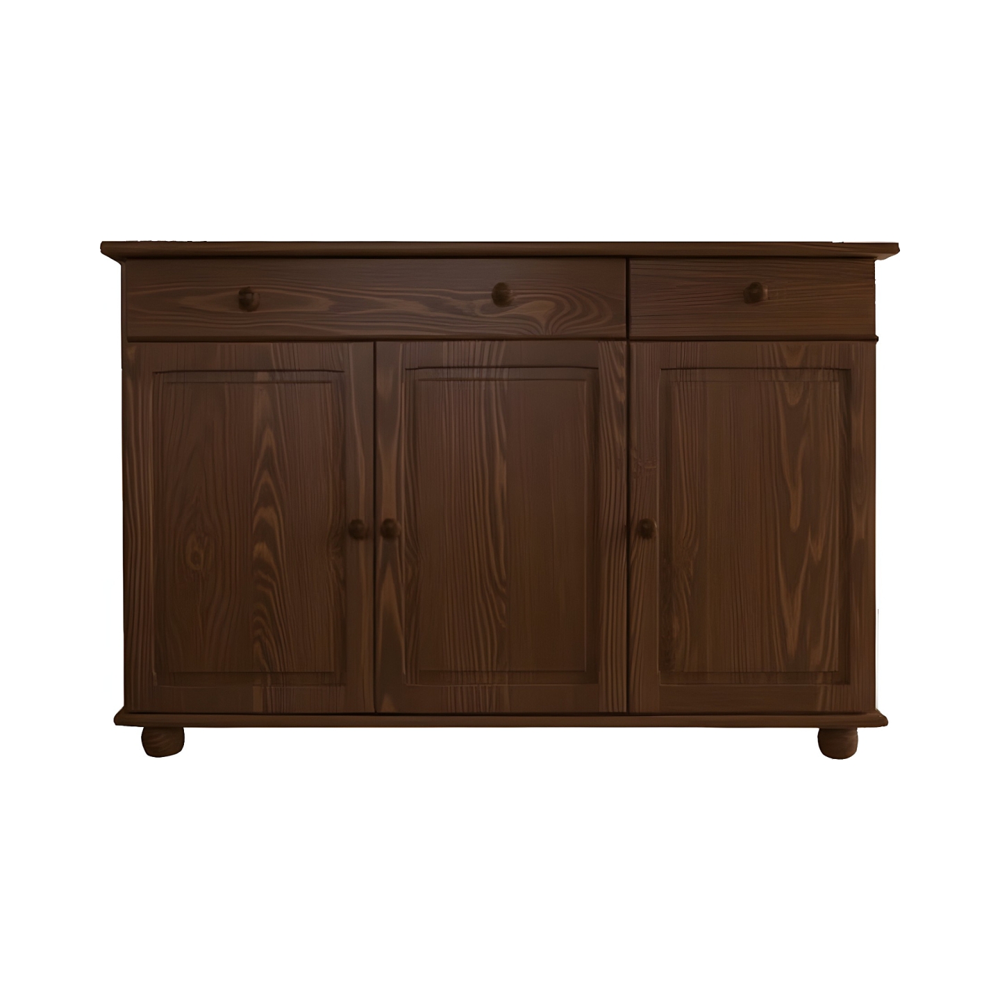 Szukasz szerokiej i pojemnej komody drewnianej, która łączy zalety szuflad i zamkniętych szafek? Prezentujemy sosnową komodę o szerokości 133 cm i głębokości 47 cm, wykonaną w całości z litego drewna sosnowego, wykończonego bejcą. Mebel ten jest idealny do przechowywania różnego rodzaju przedmiotów w sypialni, salonie lub jadalni.