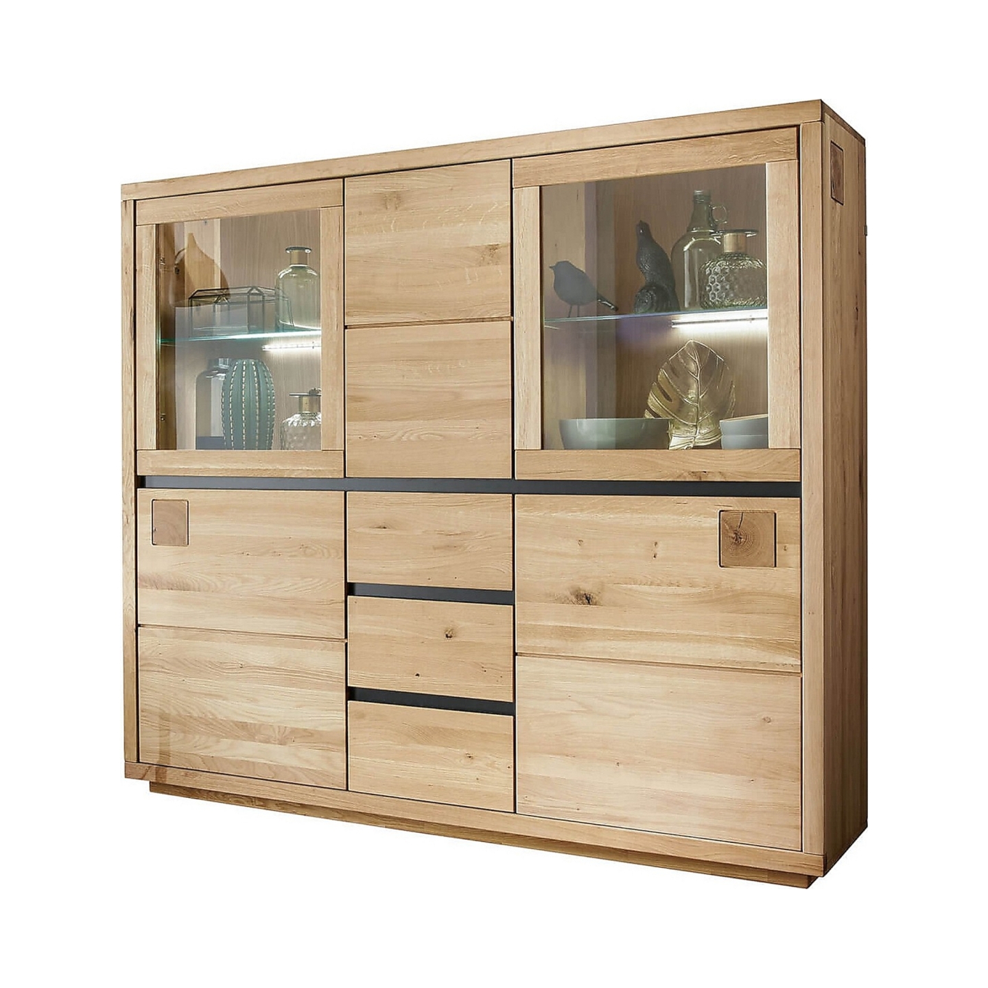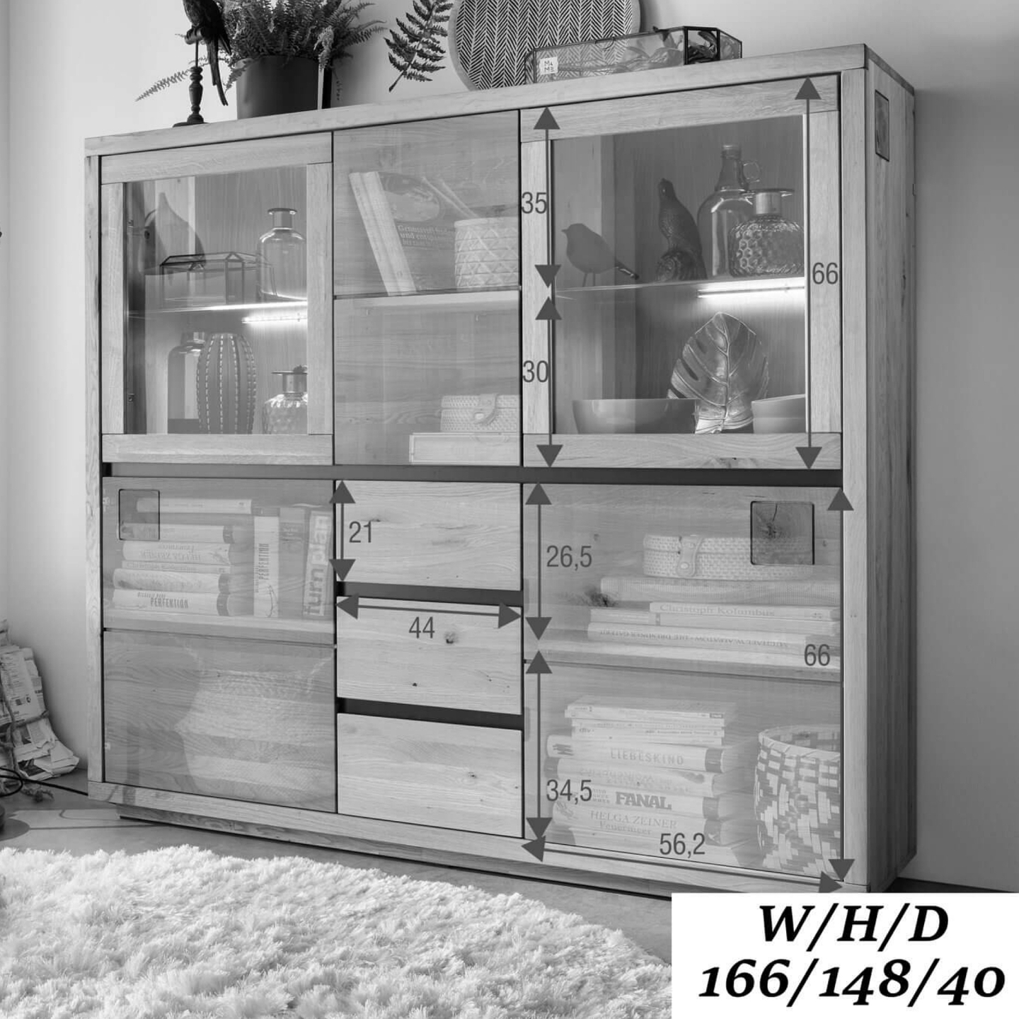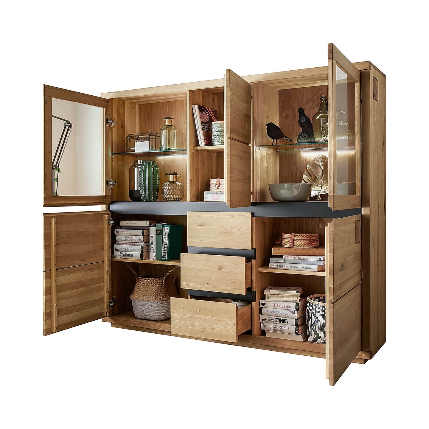 Korpus i fronty z litego dębu zapewniają dużą sztywność oraz odporność na odkształcenia. Olejowane wykończenie pozwala drewnu „oddychać” i dobrze radzić sobie w pomieszczeniach, gdzie temperatura i wilgotność delikatnie się zmieniają. W meblu zastosowano czarne akcenty i geometryczne detale, które dodają mu nowoczesnego, loftowego wyglądu.