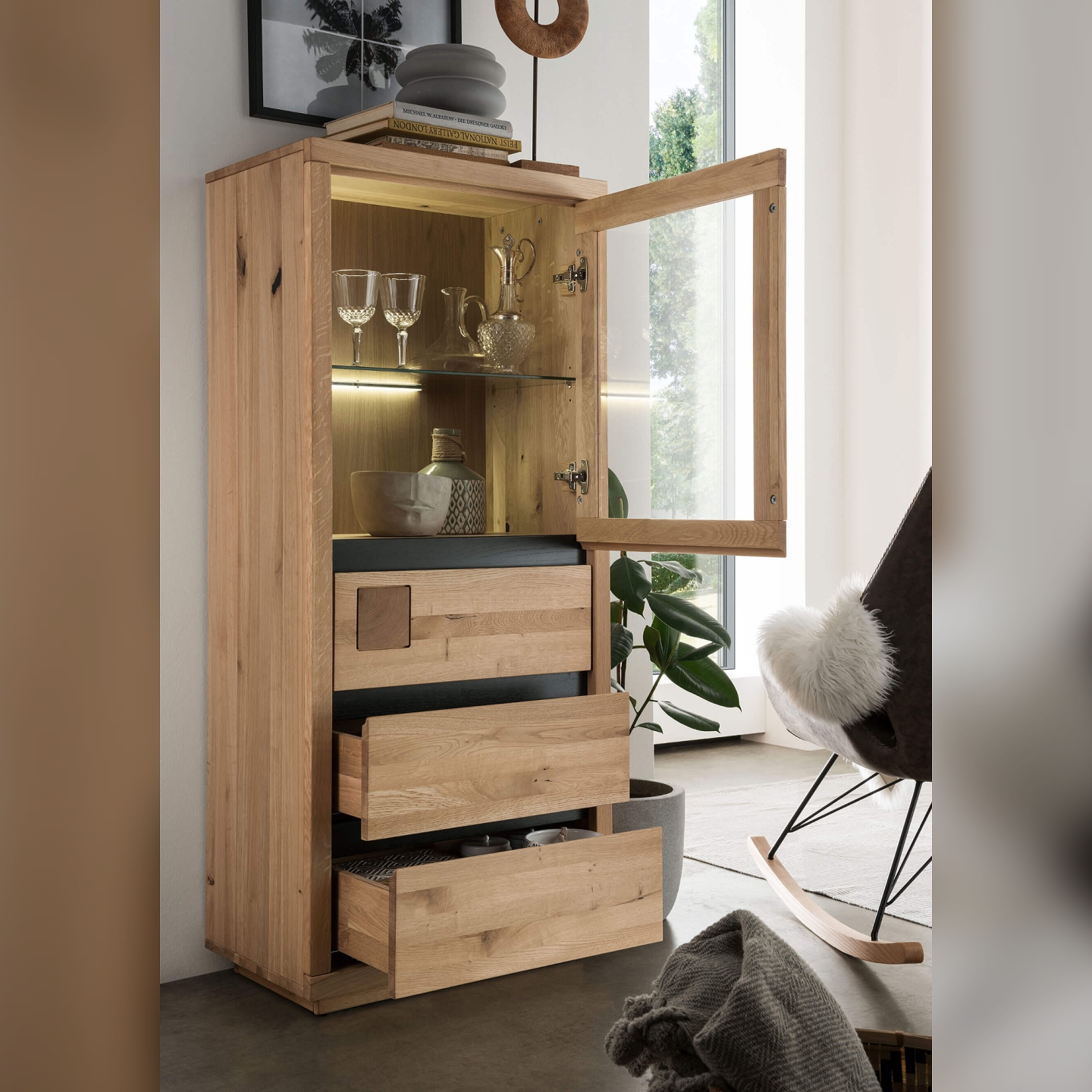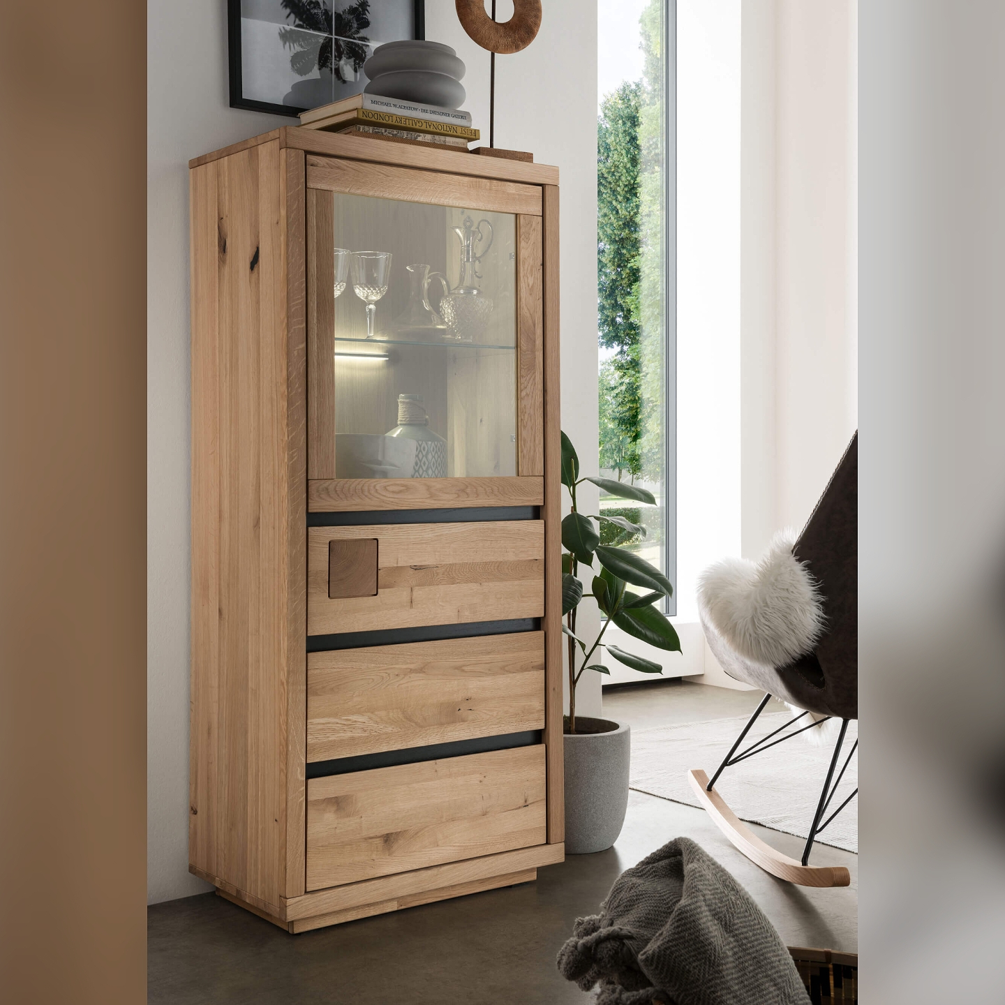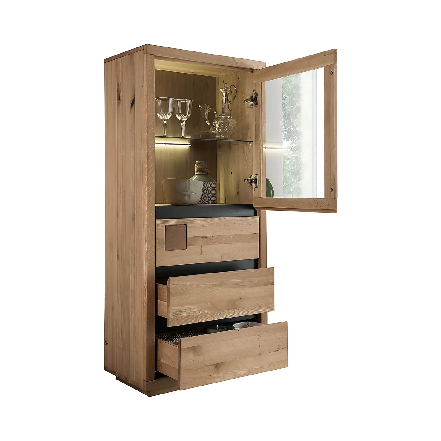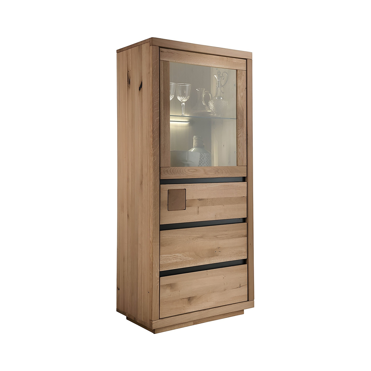 Lite drewno dębowe zapewnia sztywność mimo niewielkiego formatu, a matowy olej uwydatnia słoje i sęki. Takie wykończenie nadaje meblowi spokojny, naturalny charakter i wymaga tylko podstawowej pielęgnacji. Przeszklona część tworzy bezpieczną przestrzeń do ekspozycji dekoracji lub zastawy.