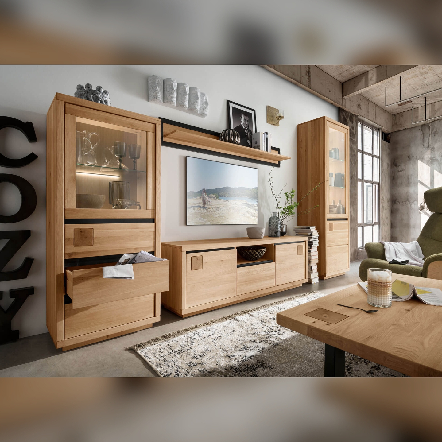 👉 Połączenie funkcji: trzy szuflady na przechowywanie i szklane drzwi do ekspozycji.