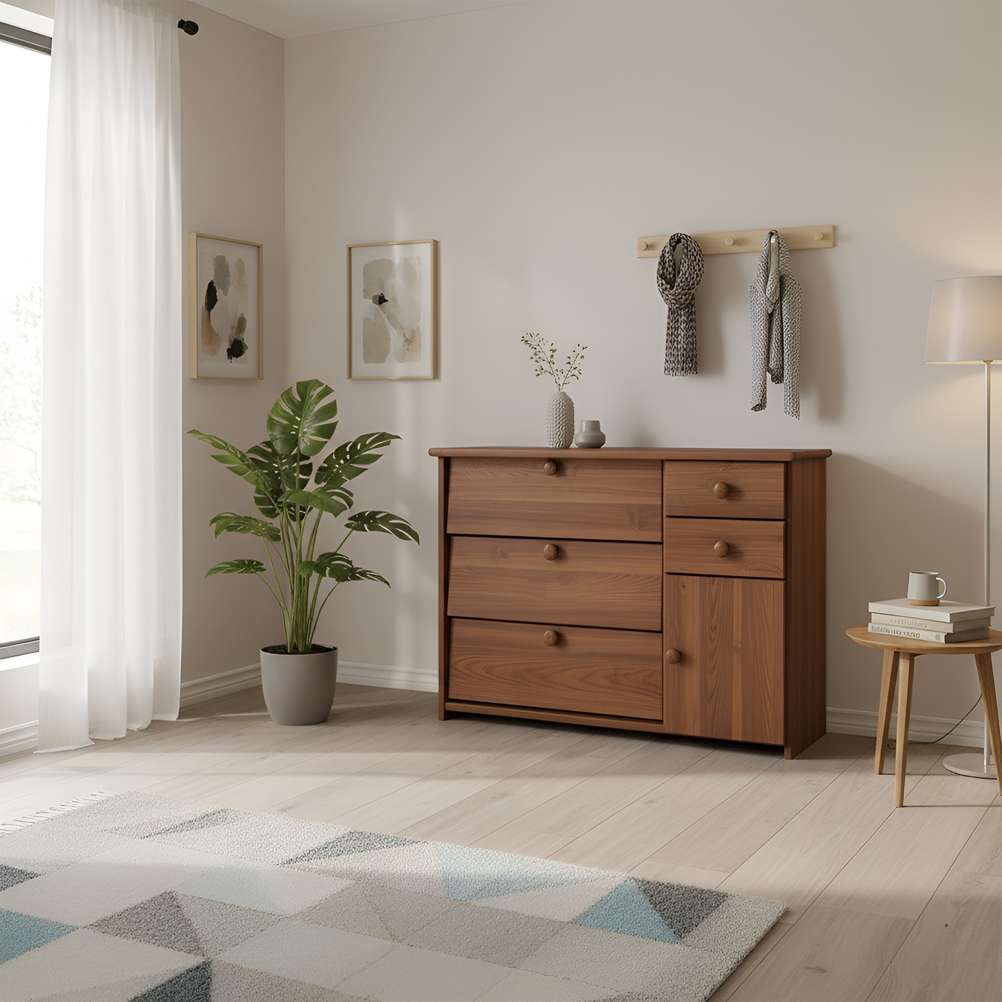 Szukasz szerokiej i funkcjonalnej szafki na buty drewnianej, która zaoferuje maksimum miejsca do przechowywania obuwia i akcesoriów? Prezentujemy sosnową szafkę na buty o szerokości 90 cm i wysokości 62 cm, wykonaną w całości z litego drewna sosnowego, wykończonego bejcą. Ten mebel to idealne połączenie pojemnych koszy uchylnych i praktycznych szuflad.