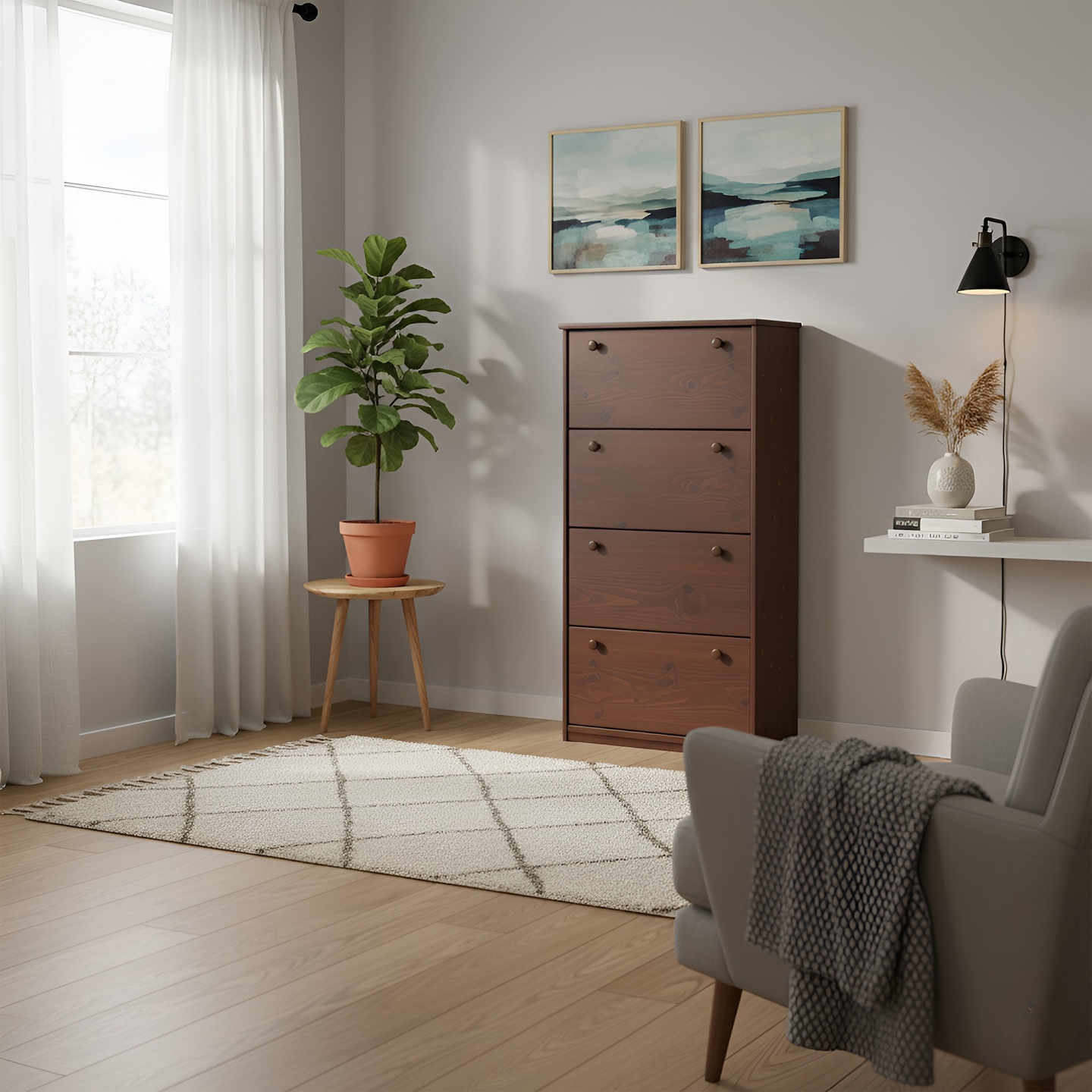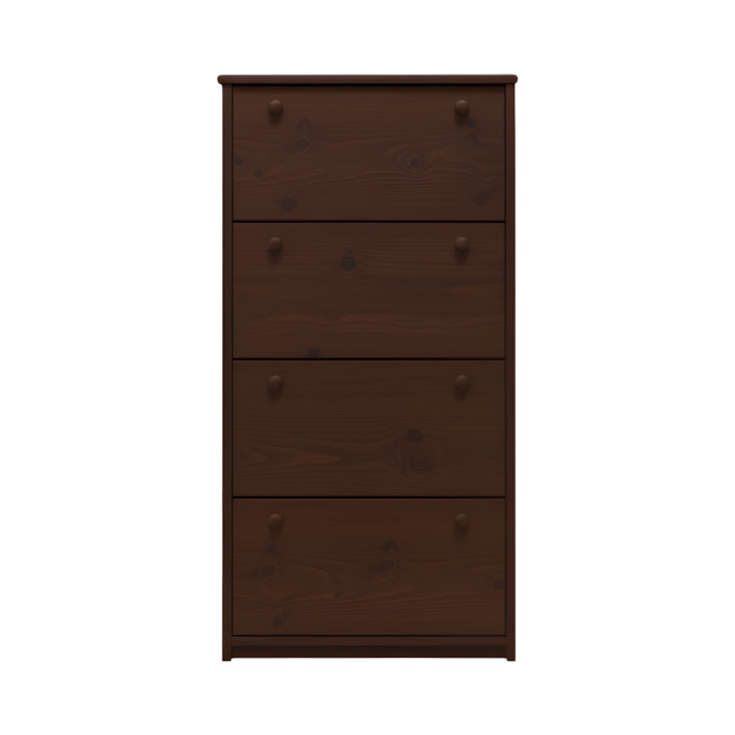 Szukasz wysokiej, ale niezwykle płytkiej szafki na buty drewnianej, która pomieści dużą ilość obuwia, nie blokując wąskiego przejścia? Prezentujemy sosnową szafkę na buty o wysokości 150 cm i głębokości zaledwie 29 cm, wykonaną w całości z litego drewna sosnowego, wykończonego bejcą. Trzy kosze uchylne efektywnie wykorzystują pionową przestrzeń.