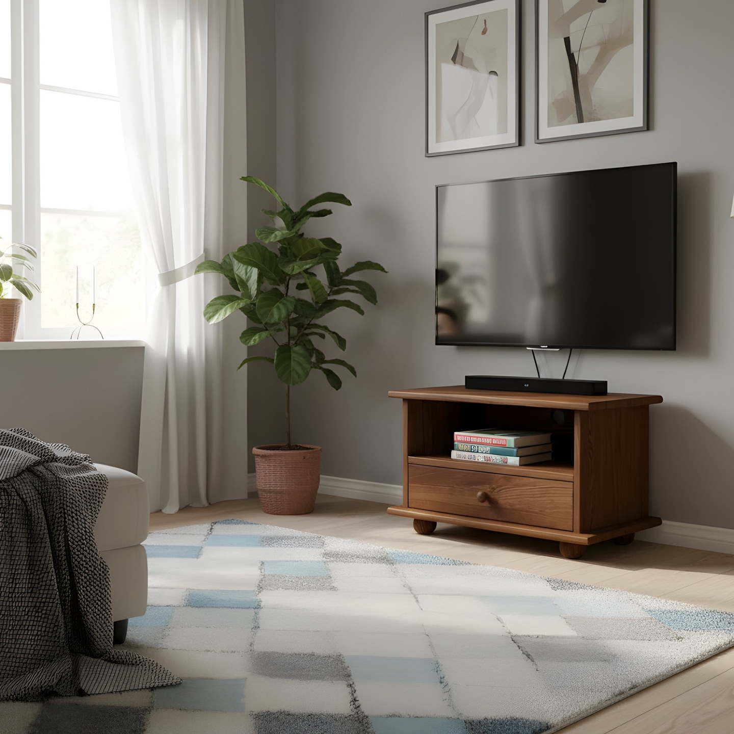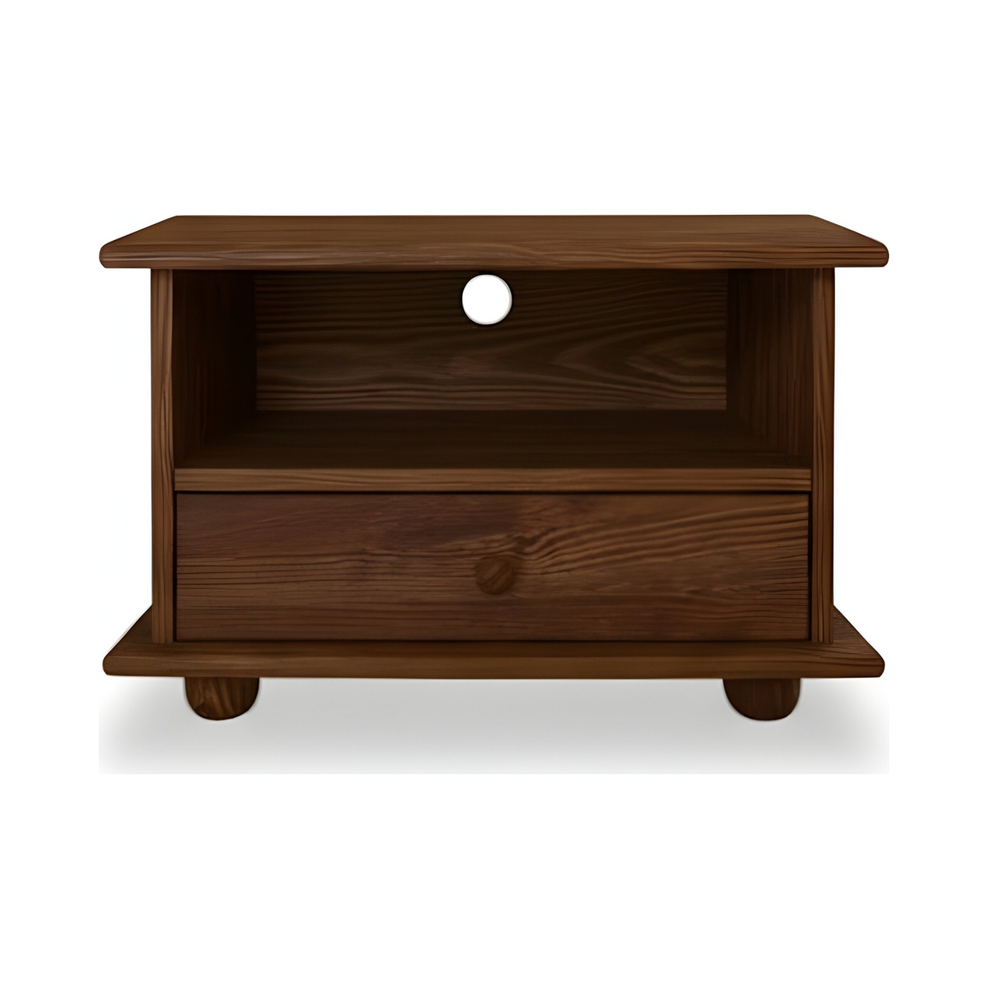Szukasz kompaktowej, klasycznej szafki RTV drewnianej? Prezentujemy sosnową szafkę pod sprzęt, idealną do małych i średnich salonów. Mebel ten został wykonany w całości z litego drewna sosnowego, wykończonego bejcą. Wąska szerokość 72 cm i niska wysokość 45 cm sprawiają, że idealnie wpasuje się pod telewizor, nie dominując przestrzeni.