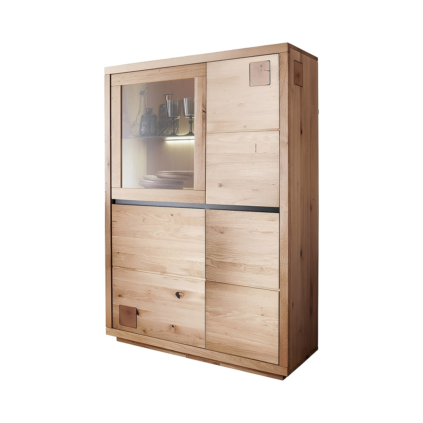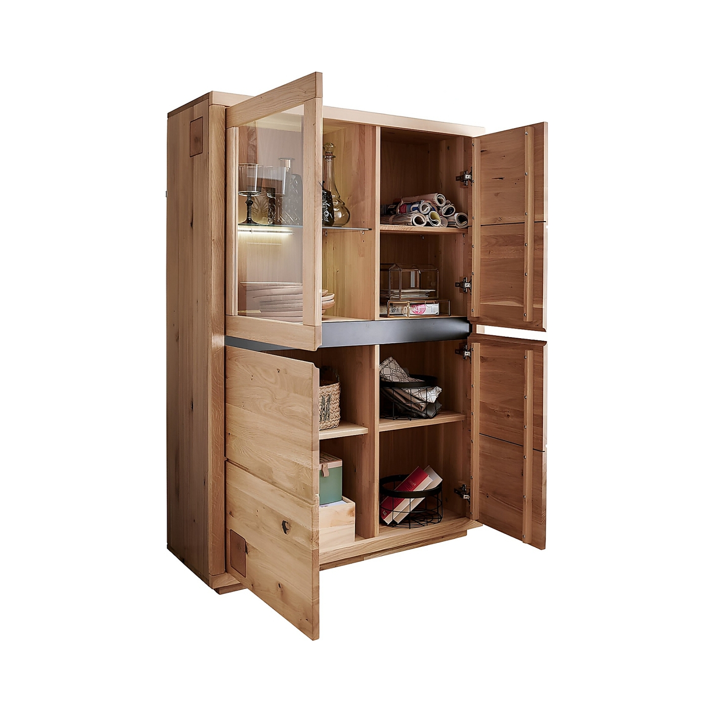 Korpus i fronty powstają wyłącznie z litego dębu, co daje twardość i sztywność, której nie zapewniają płyty kompozytowe. Powierzchnia jest olejowana bezbarwnie, dzięki czemu łatwo usunąć drobne zabrudzenia, a rysunek drewna pozostaje wyraźny. Waga 71,5 kg pokazuje masywną budowę i stabilność całego mebla.