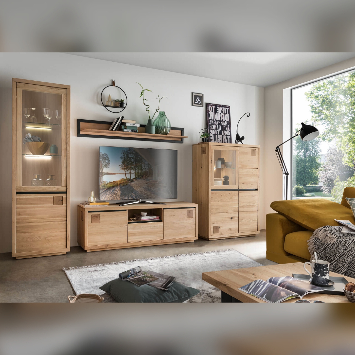 👉 Połączenie loftu i naturalnego drewna: czarne akcenty kontrastują z ciepłym dębem.