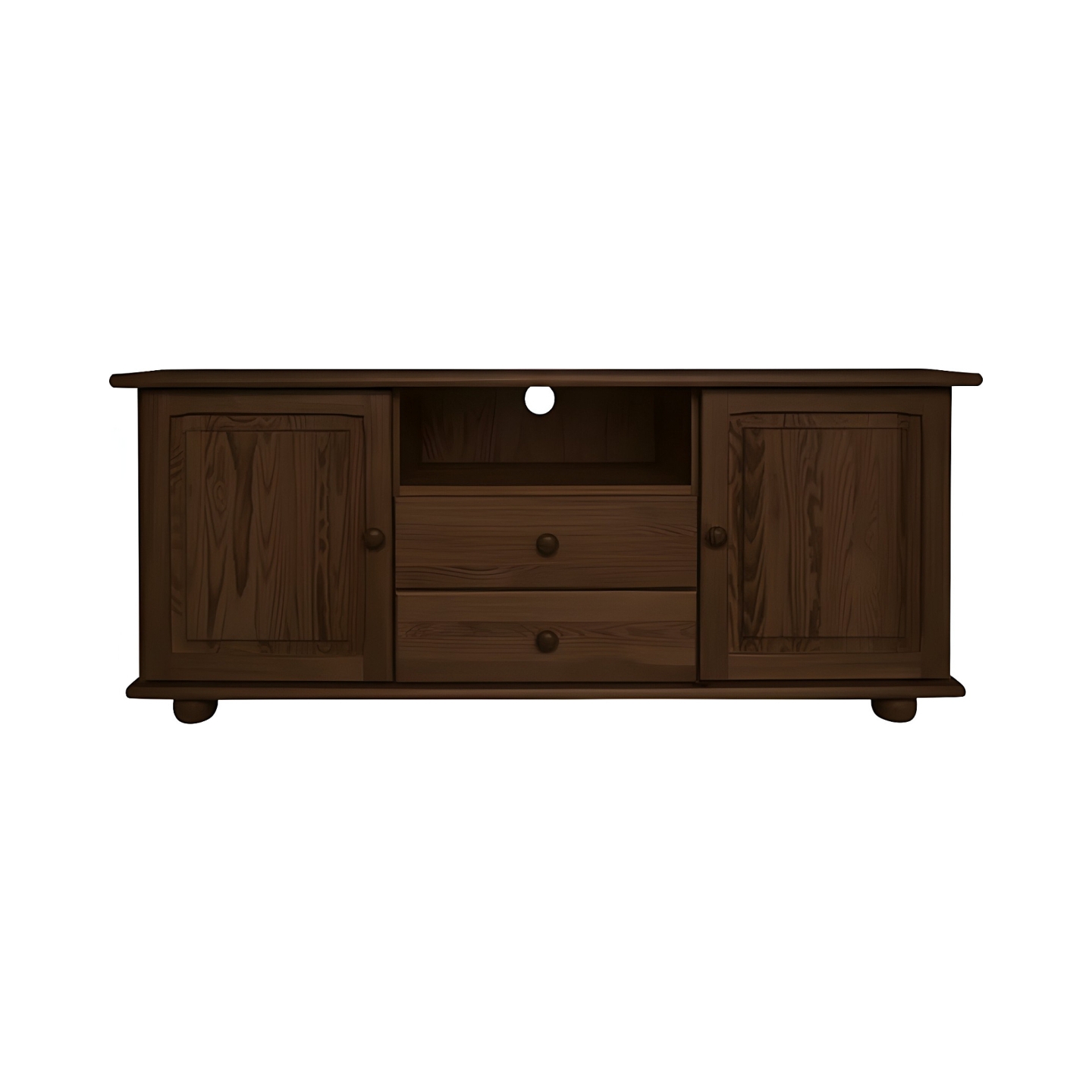Szukasz szerokiej i solidnej szafki RTV drewnianej, która pomieści sprzęt oraz akcesoria, zapewniając porządek w salonie? Prezentujemy sosnową szafkę RTV o szerokości 142 cm, wykonaną w całości z litego drewna sosnowego, wykończonego bejcą. Mebel łączy estetyczny wygląd z praktycznym, zamkniętym przechowywaniem.