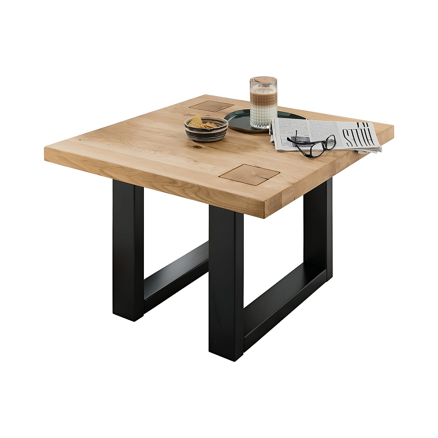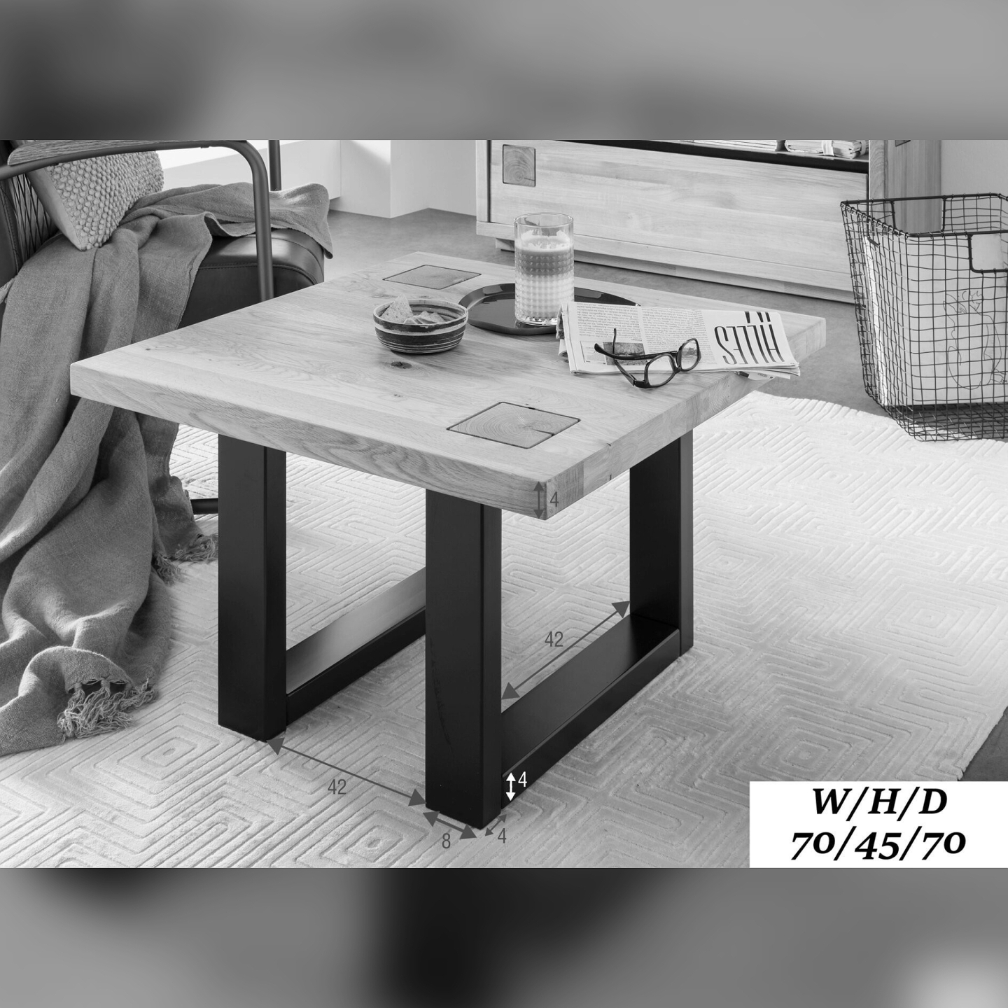 Stolik kawowy Fende 70×70 to solidny mebel z litego dębu, z naturalnym blatem olejowanym i czarną dębową podstawą. Jest ciężki, stabilny i dopracowany w detalach, a wstawki z końca belek podkreślają rzemieślniczną konstrukcję.