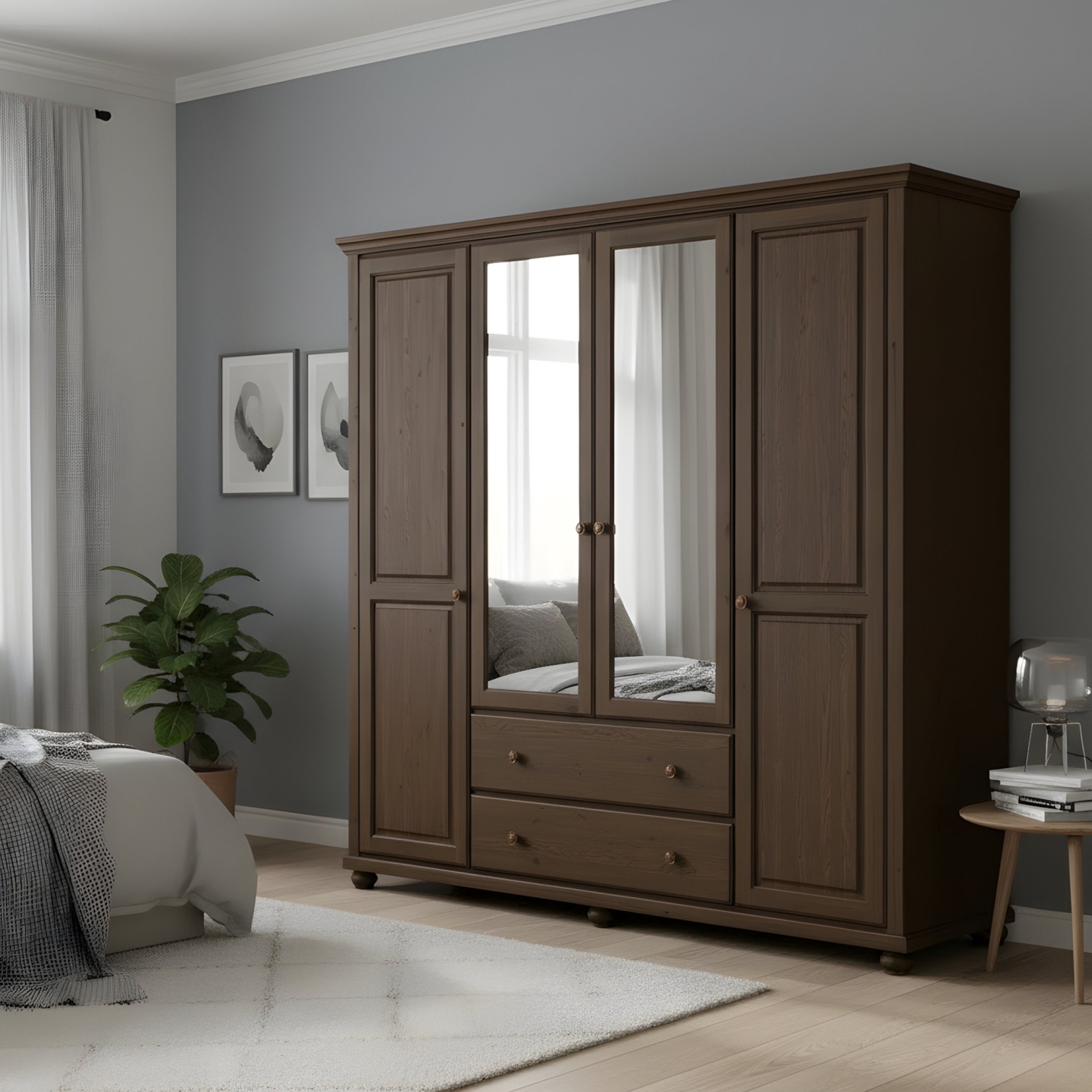 Szukasz dużej, imponującej szafy drewnianej o ponadczasowym designie i maksymalnej funkcjonalności? Prezentujemy trzydrzwiową szafę sosnową z lustrem, która łączy naturalne piękno drewna z praktycznymi rozwiązaniami do przechowywania. Dzięki szerokości 163 cm, wysokości 210 cm i głębokości 62 cm, szafa ta oferuje ogromną przestrzeń dla dwóch osób. Mebel wykonano w całości z litego drewna sosnowego, wykończonego bejcą.