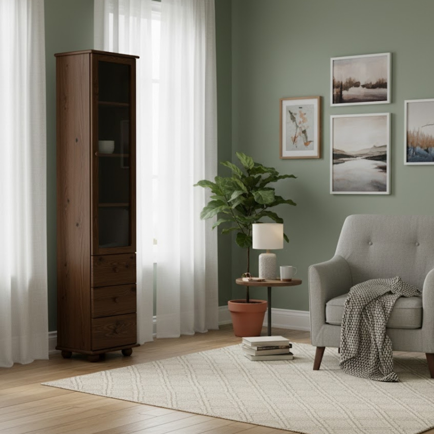 Szukasz wysokiego, bardzo wąskiego i płytkiego słupka witrynowego, idealnego do wypełniania wnęk lub wykorzystania niewielkiej przestrzeni? Prezentujemy sosnową witrynę z oszklonymi drzwiami o szerokości zaledwie 43 cm. Mebel ten został wykonany w całości z litego drewna sosnowego, wykończonego bejcą. Z wymiarami 43 cm szerokości i 190 cm wysokości, jest to perfekcyjne rozwiązanie do estetycznej ekspozycji przy minimalnym zajmowaniu miejsca.