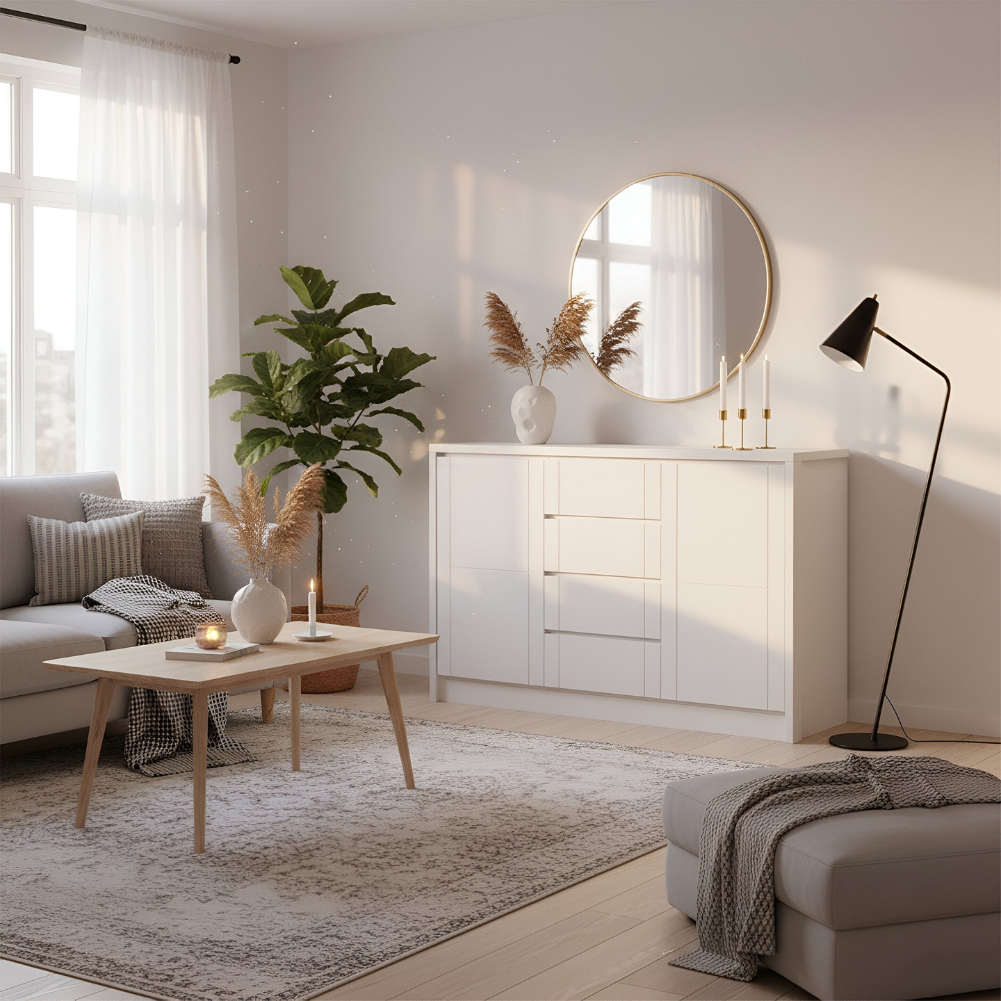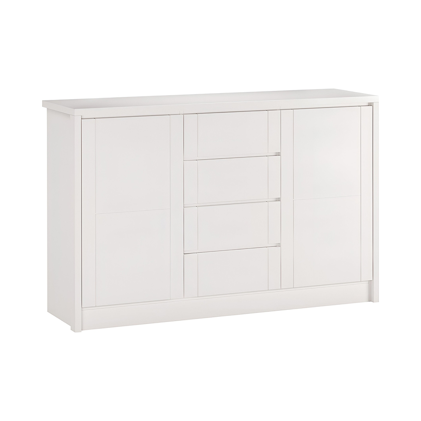 Wprowadź do swojego domu elegancję i funkcjonalność dzięki BIAŁEJ KOMODZIE BUKOWEJ TIMO 4. Ten szeroki i pojemny mebel, widoczny na zdjęciu jako biała szafka łącząca dwa boczne skrzydła drzwiowe z centralnie umieszczonymi czterema szufladami, stanowi idealne rozwiązanie do salonu, jadalni czy sypialni. Komoda jest w 100% wykonana z litego drewna najwyższej jakości, co gwarantuje jej niezrównaną trwałość oraz solidność. Dominujące drewno bukowe, użyte do konstrukcji skrzyni i frontów, podkreśla jej masywność i szlachetny charakter. Wykończenie lakierem białym kryjącym sprawia, że mebel jest uniwersalny i doskonale wkomponuje się w jasne, nowoczesne oraz skandynawskie wnętrza. Imponująca szerokość 153,7 cm zapewnia ogromną przestrzeń do przechowywania.
