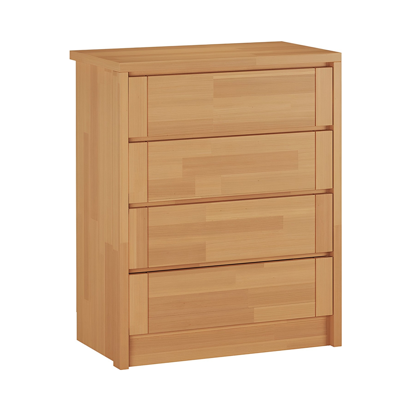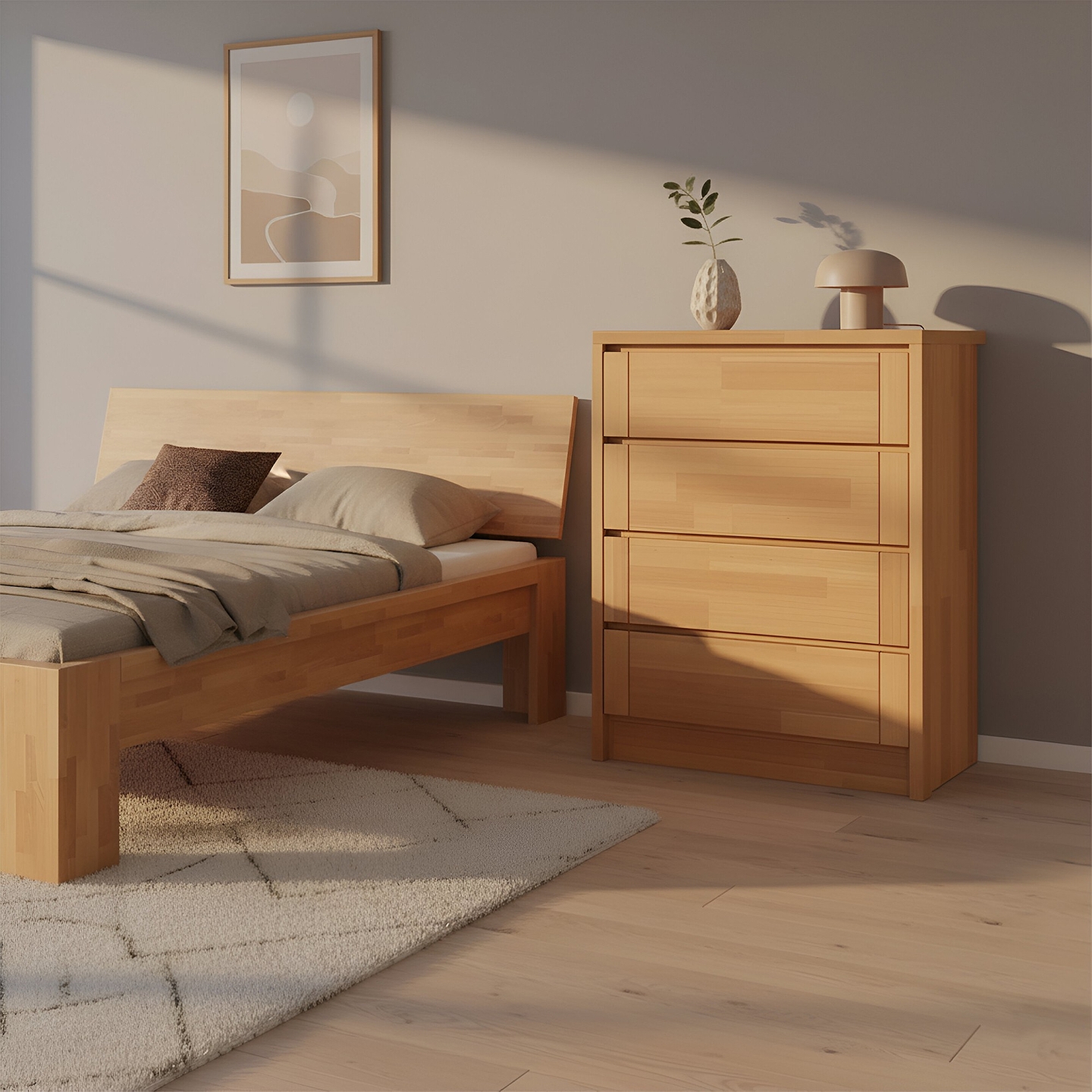 Komoda bukowa TIMO 5 to funkcjonalne i estetyczne rozwiązanie idealne do mniejszych przestrzeni. Ta wąska, drewniana komoda z 4 szufladami, widoczna na zdjęciu o ciepłym, naturalnym wybarwieniu, liczy zaledwie 80 cm szerokości, co czyni ją doskonałą do niedużego salonu, przedpokoju czy sypialni. Wykonana w 100% z litego drewna najwyższej jakości, stanowi gwarancję solidności, stabilności i długowieczności. Dominujące drewno bukowe, wykorzystane do budowy skrzyni i frontów, nadaje jej masywnej konstrukcji szlachetny i ponadczasowy charakter. Naturalny odcień materiału został podkreślony lakierem lub olejem, co nie tylko zwiększa estetykę, ale i odporność na uszkodzenia.