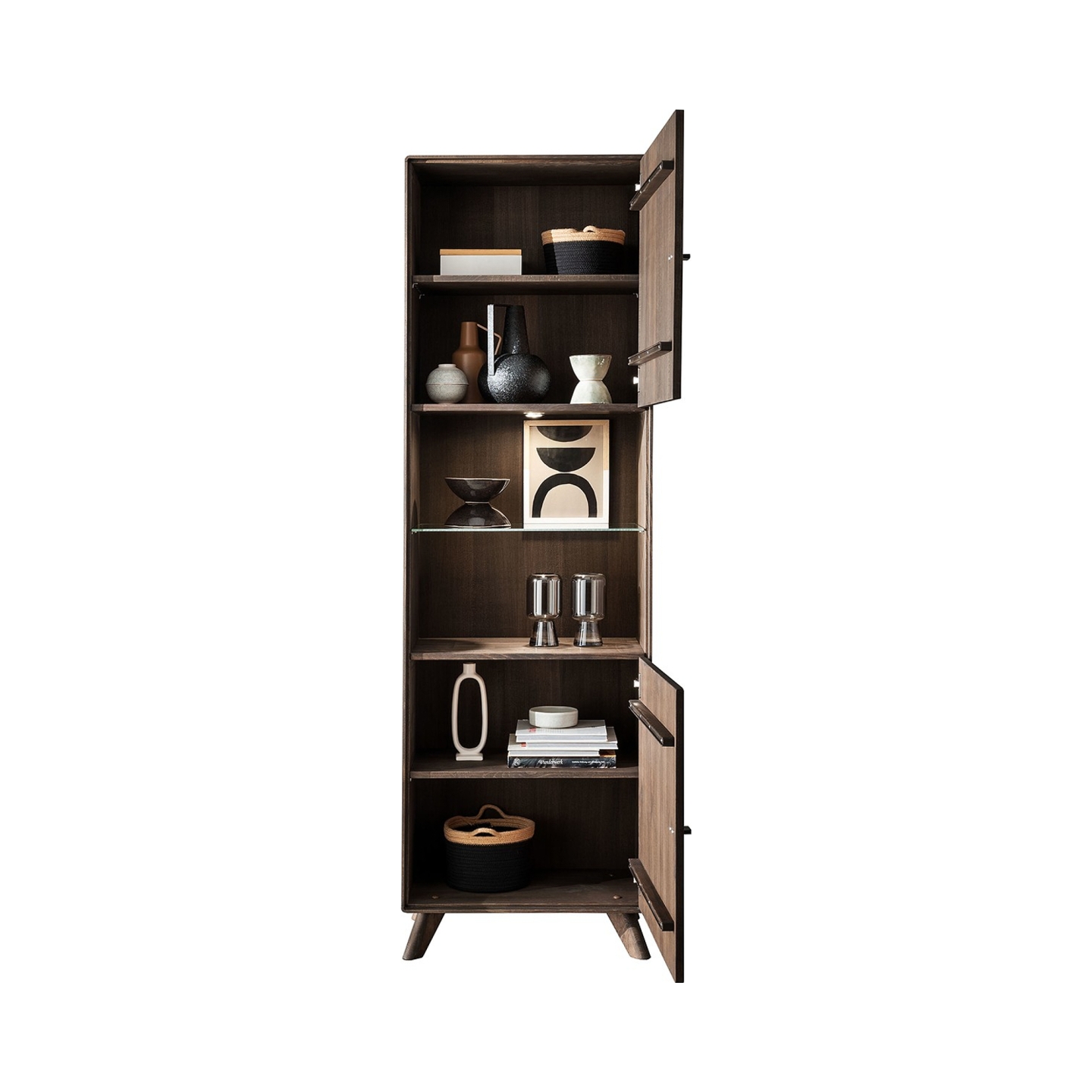 Wprowadź do swojego salonu lub jadalni pionową elegancję z Witryną bukową I Doryda. Ta wysoka (208,8 cm) i jednocześnie smukła (65 cm) witryna, wykonana z najwyższej jakości litego drewna bukowego, jest idealna do eksponowania cennych przedmiotów dekoracyjnych. Głęboki odcień buk tabak, uzyskany dzięki wykończeniu olejem tytoń, tworzy szlachetny i modny kontrast w jasnych, nowoczesnych wnętrzach. Mebel spoczywa na minimalistycznych nóżkach, które dodają mu wizualnej lekkości, jednocześnie zachowując imponującą stabilność, potwierdzoną wagą 61,6 kg.