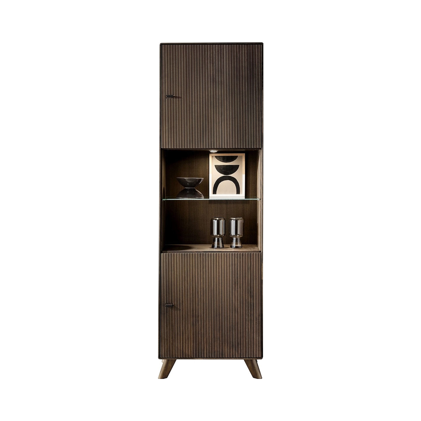 Ta solidna witryna z litego buku to więcej niż tylko mebel do przechowywania – to element dekoracyjny, który przyciąga wzrok. Smukła forma i duża wysokość witryny Doryda I pozwalają optymalnie wykorzystać przestrzeń wertykalną w pomieszczeniu. Ciemne, olejowane drewno bukowe w kolorze tabak jest nie tylko wytrzymałe, ale i łatwe w pielęgnacji, a jego odporność na uszkodzenia sprawia, że mebel będzie cieszył oko przez dekady. Połączenie otwartych przestrzeni ekspozycyjnych z zamkniętymi szafkami (głębokość wewnętrzna 37 cm) daje idealną równowagę między prezentacją a dyskretnym przechowywaniem. Ryflowane fronty stanowią element nietypowego wzornictwa, który wyróżnia tę witrynę na tle standardowych mebli salonowych.