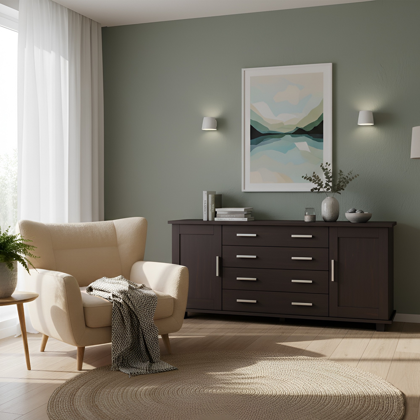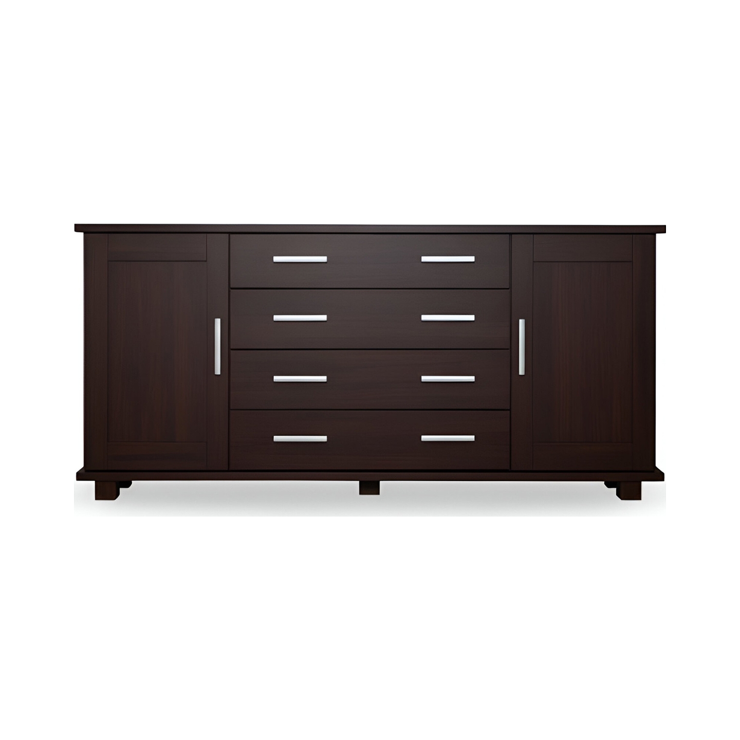 Bardzo szeroka komoda o długości 165 cm, wykonana w całości z twardego drewna bukowego. Jest to pojemny i solidny mebel, który doskonale sprawdzi się w sypialni, oferując zróżnicowane opcje przechowywania – szuflady i zamykane szafki. Mebel stoi na prostokątnych, drewnianych nóżkach.
