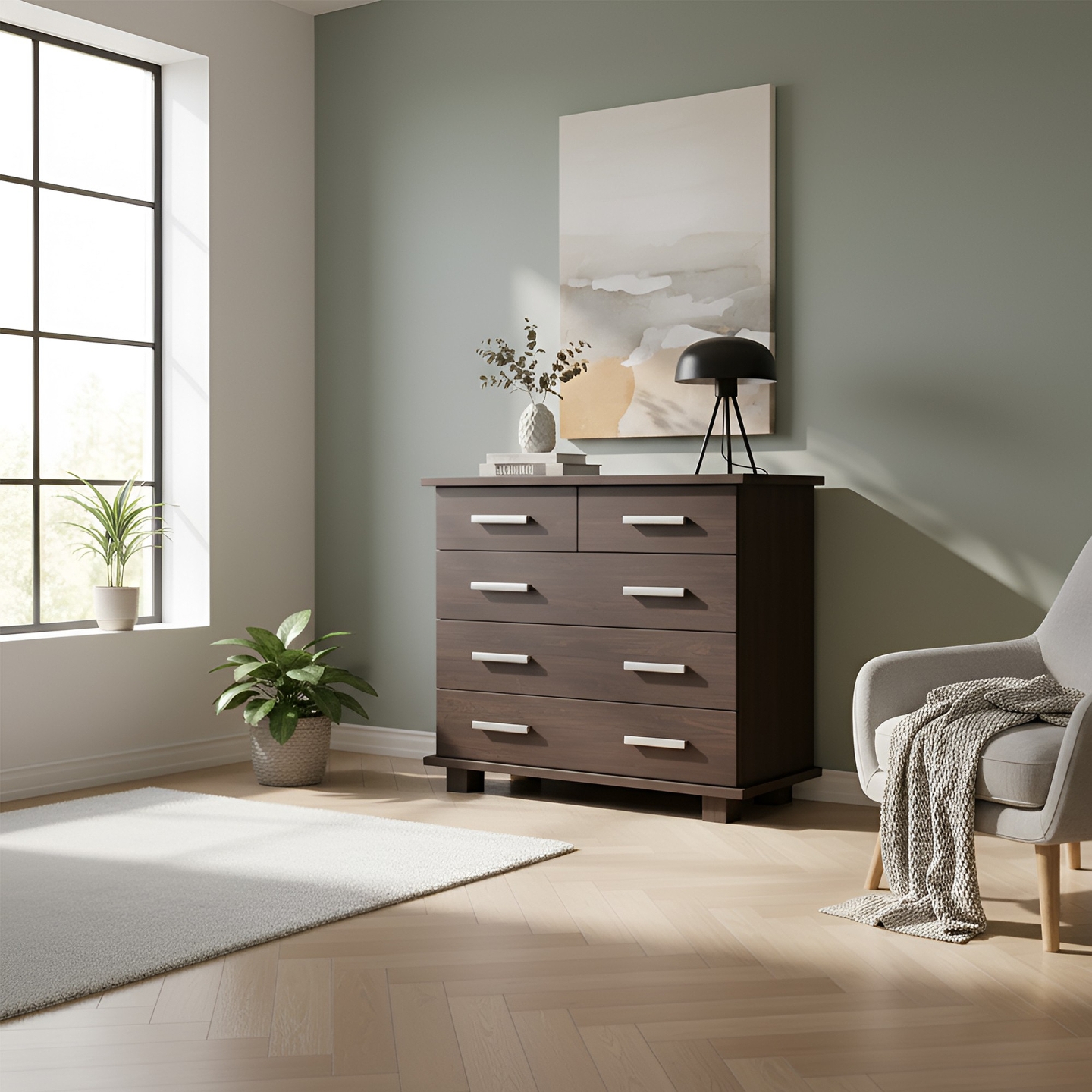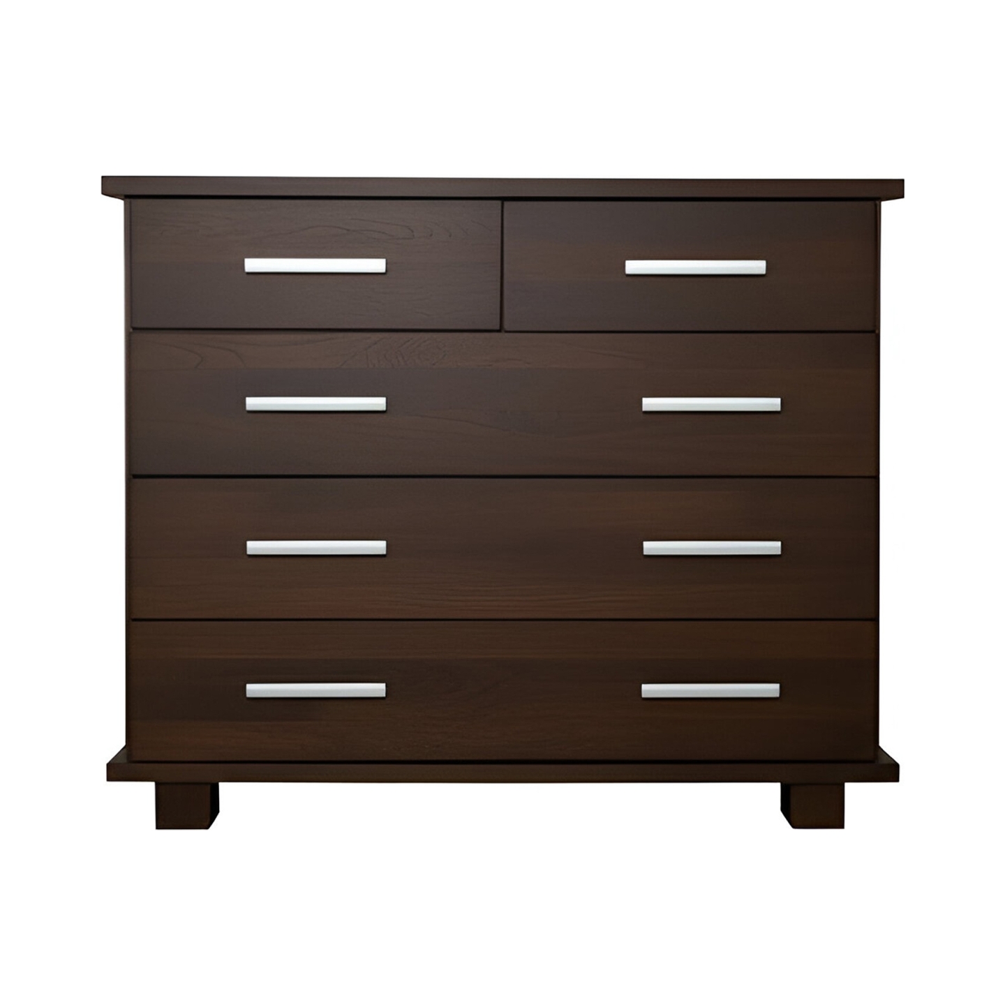 Kompaktowa komoda o szerokości 85 cm i wysokości 75 cm, wykonana w całości z twardego drewna bukowego. Jest to solidny i estetyczny mebel, wyposażony w pojemne szuflady. Idealnie sprawdzi się w sypialni, a jej wysokość ułatwia wykorzystanie górnego blatu.
