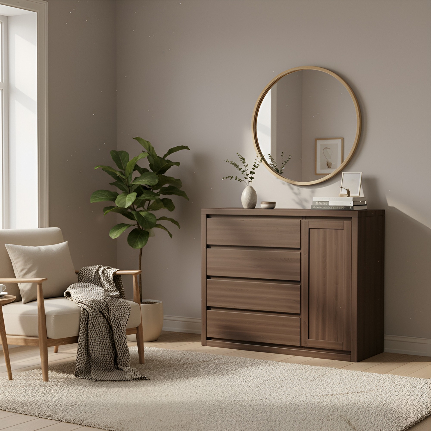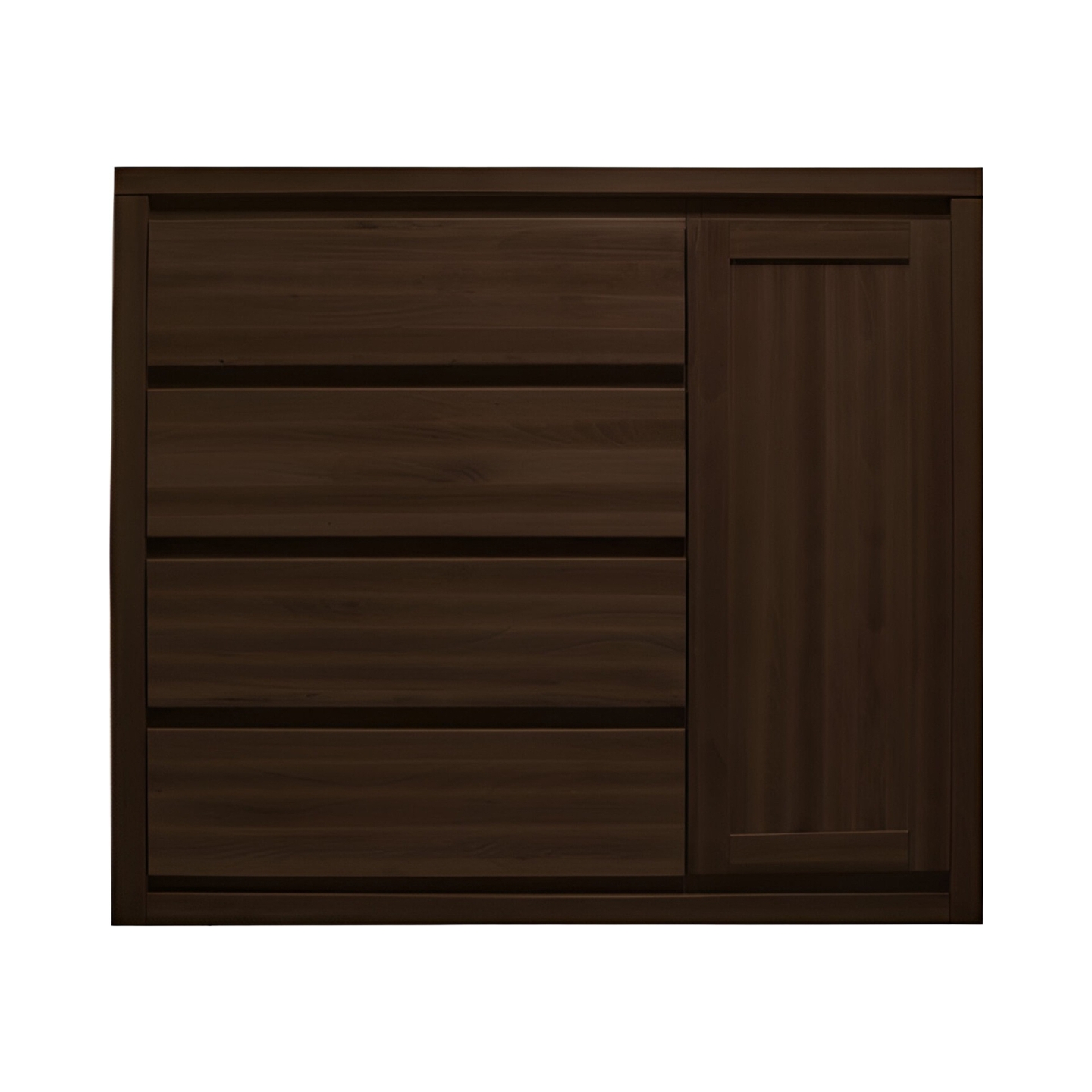 Luksusowa komoda o szerokości 120 cm, wykonana w całości z twardego drewna bukowego. Pogrubiony korpus i bezuchwytowy system otwierania (podcięcia na palce) nadają jej designerski i nowoczesny charakter. To solidny mebel na cokole, idealny do sypialni.